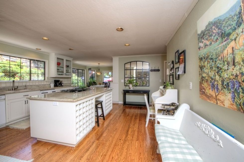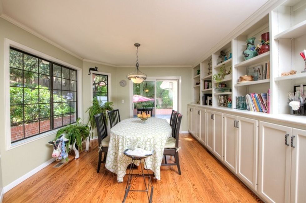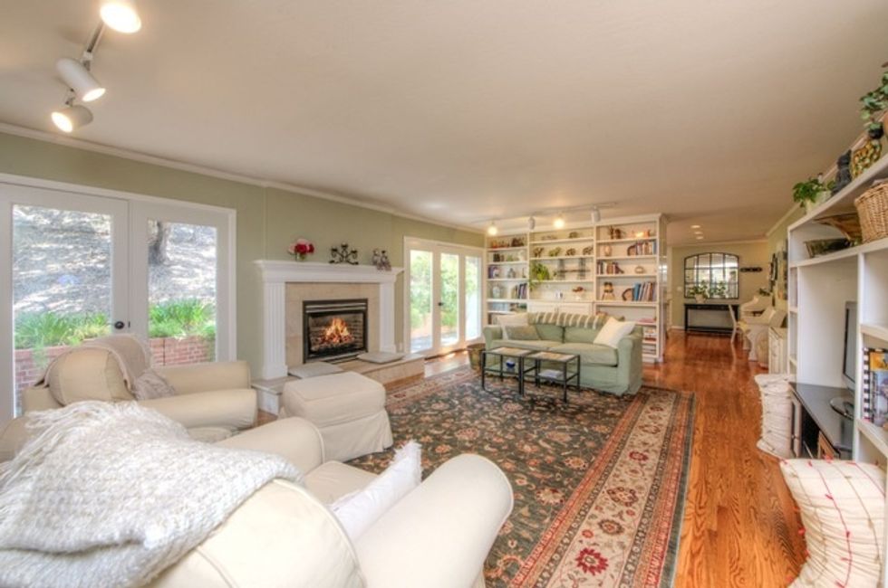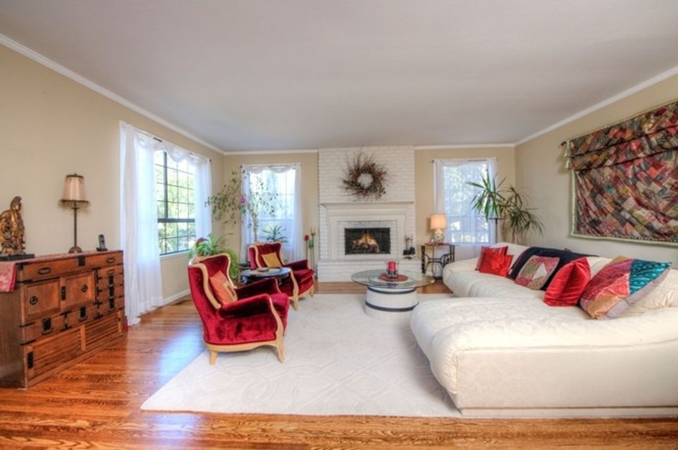 The house has picture windows throughout, three fireplaces, and quirky tiling—not to mention high ceilings, large light-filled rooms, hardwood floors, and a combination of formal and informal spaces.
