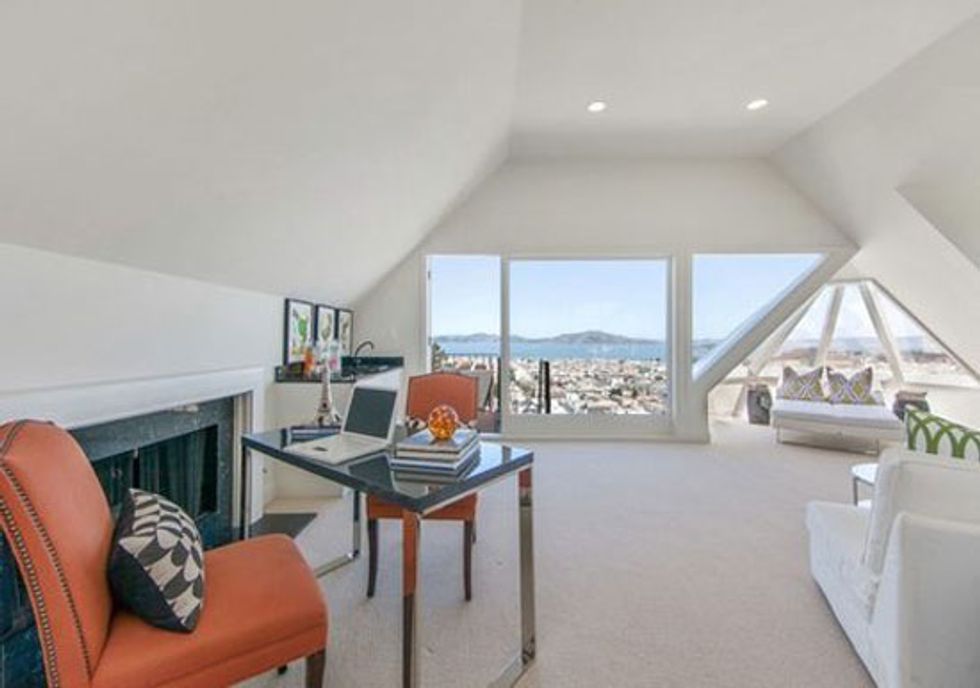 Built in 1889, the historical exterior still has intricate detailing with peaked roofs and ornamental touches. Inside, one of the bathrooms includes a Jacuzzi tub with views of the bay (sold!). And check out the "pentroom" on the top floor (it has a stained glass window in the floor!). The house was designed by architect Samuel Newsom, known for his Queen Anne homes as well as the Oakland and Berkeley city halls and the Napa Valley Opera House.