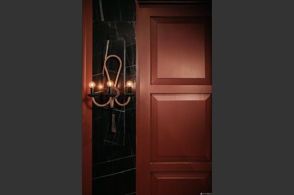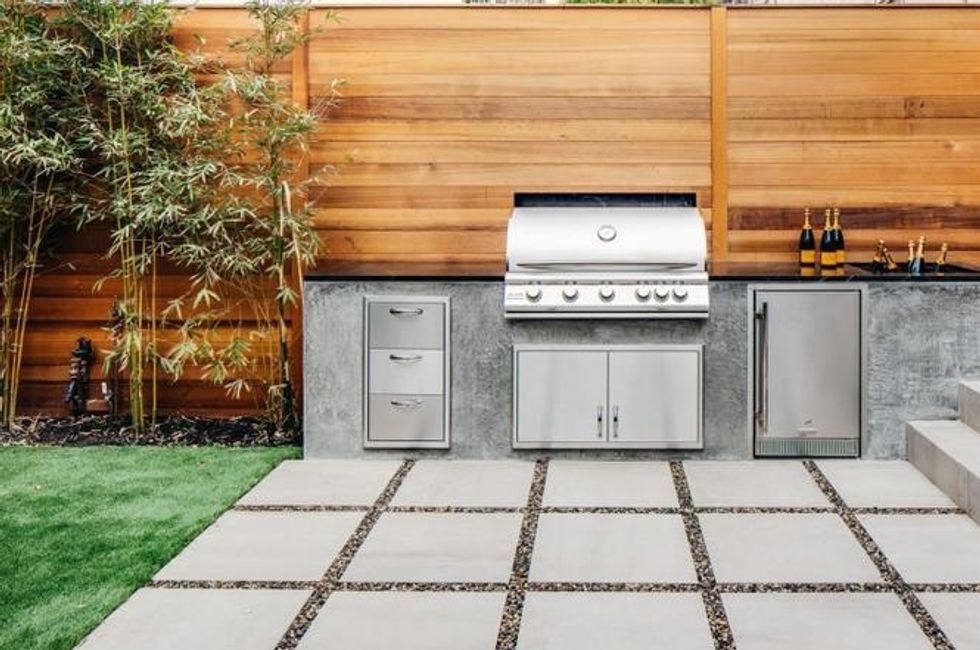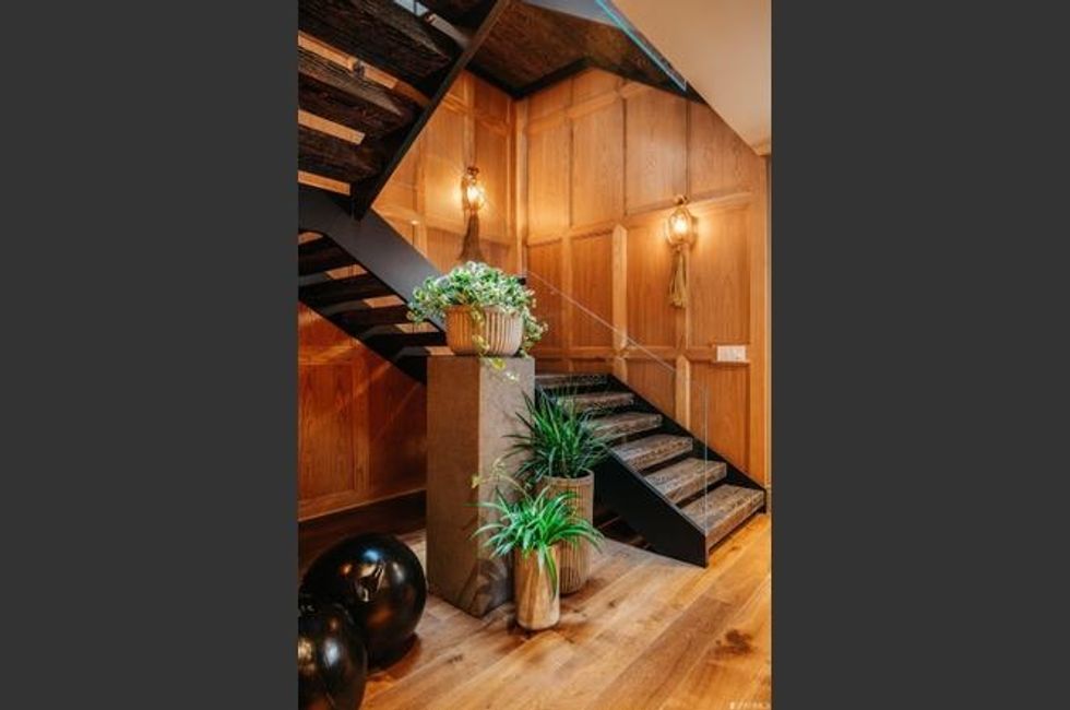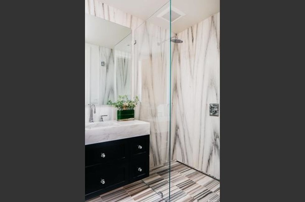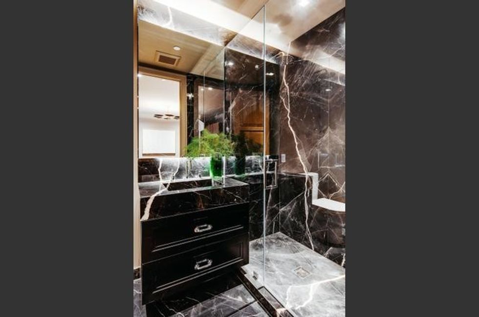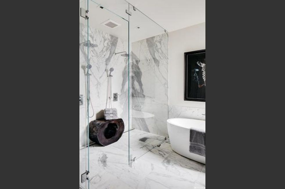 The main floor is party central, with a series of rooms well suited for entertaining. The dining room has a trio of chandeliers for twinkling meals; a separate breakfast room opens onto the backyard; and the kitchen is a showstopper with a stunning modern island and countertops rendered in gold-streaked black marble. Cocktail hour means a trip to the wet bar (there are two wine fridges with plenty of storage) before gathering among the leafy bamboo on the patio. For warm nights, there's an outdoor kitchen too. Too chilly? Lounge around in front of the 14-foot custom marble fireplace in the living room.