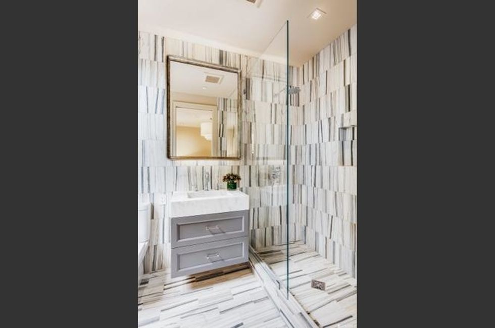 But to be honest, this house is all about the fabulous bathrooms, five in total. Dressed all in white marble, one master bath is practically a hydrotherapy heaven with a soaking tub and dual shower heads and sinks; the smaller bathrooms pack big impact with eye-popping wallpapers and tiles.