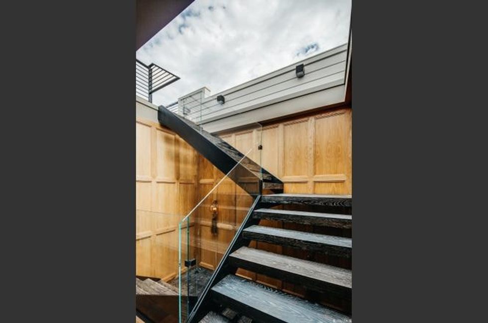 Going up? A contemporary oak staircase will take you to the roof deck for 360-degree city views, or you can ride the elevator to one two master suites, with fireplaces and balconies overlooking the garden. There are four bedrooms in all.