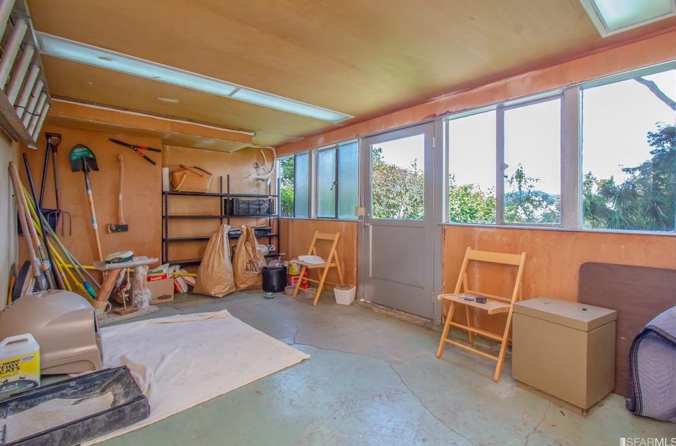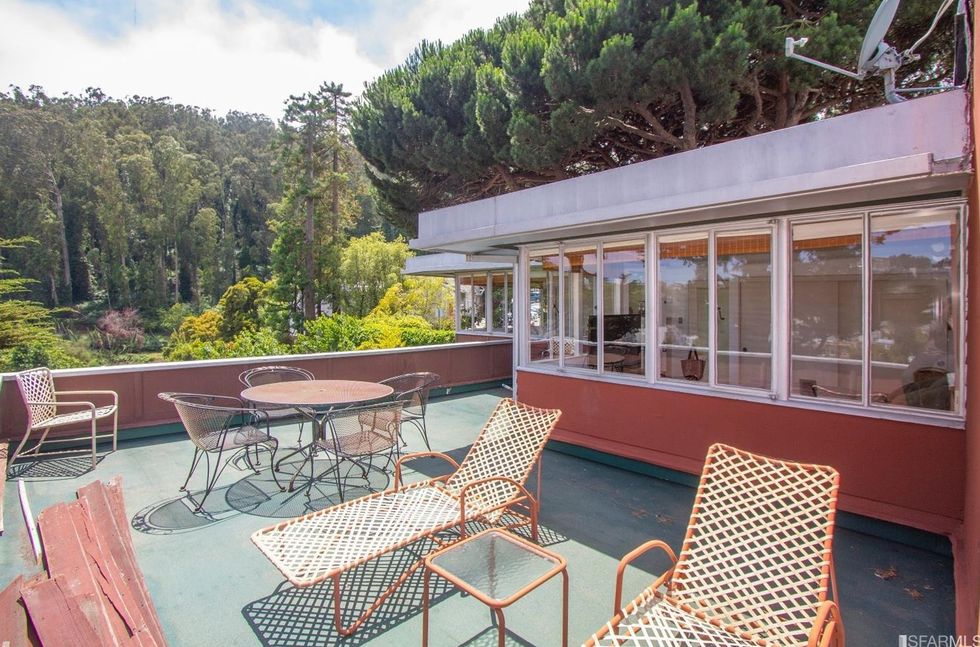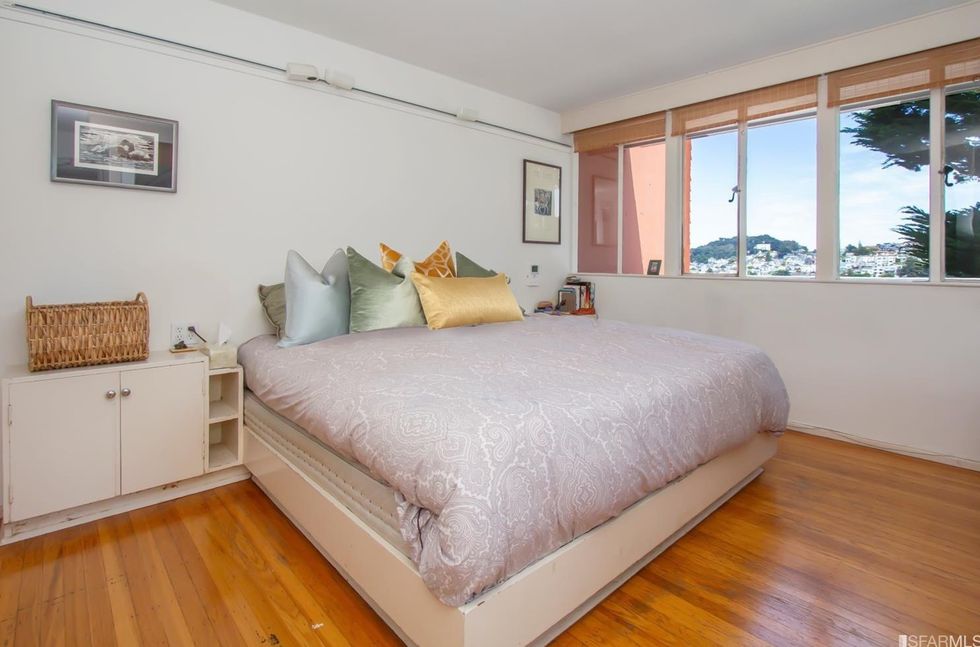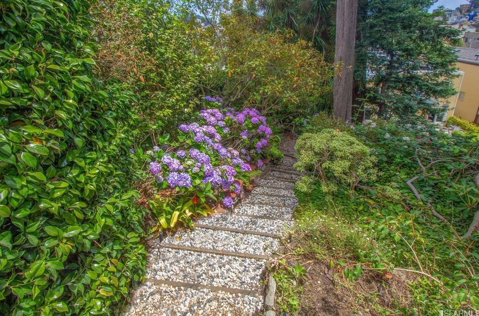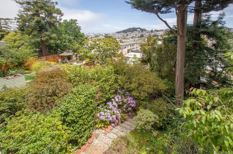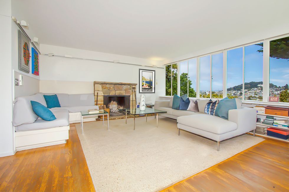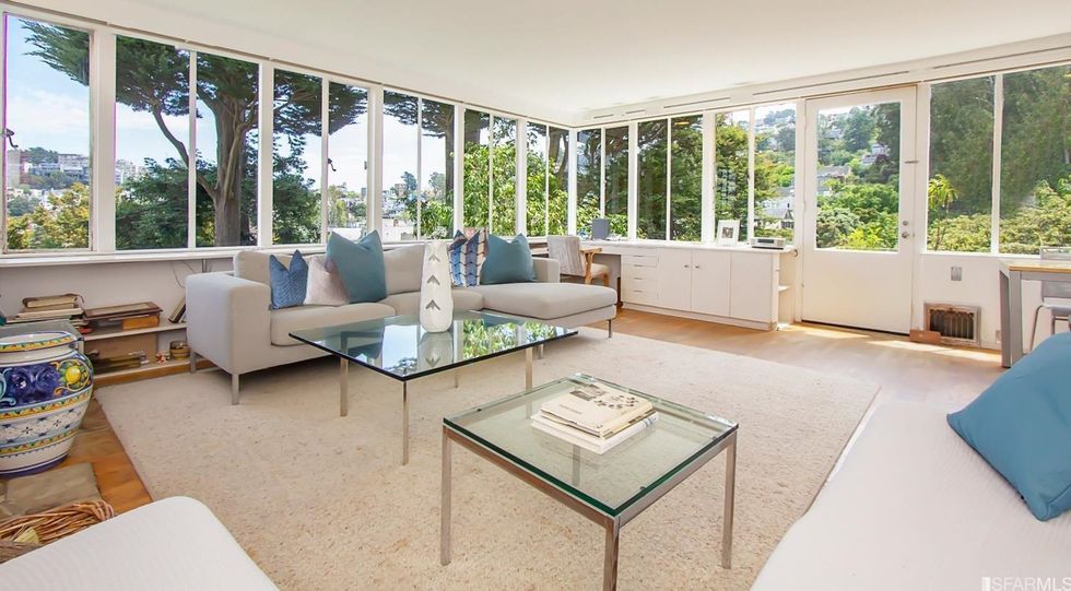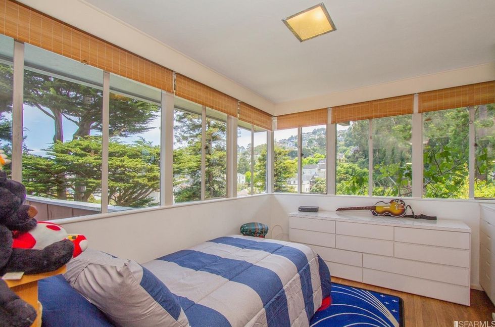 Inside, mirrored glass walls expand the living areas while wraparound windows flood the space with natural light and views of the city and Mount Sutro. The panoramas continue on a large deck off the master bedroom, immersed in trees overlooking the garden with meandering paths. The three bedrooms also have windows that span at least one wall and let in stretching landscapes. A bonus room can easily become a home office, yoga studio, or den, and a full basement area offers endless storage space—or an artist's workshop.