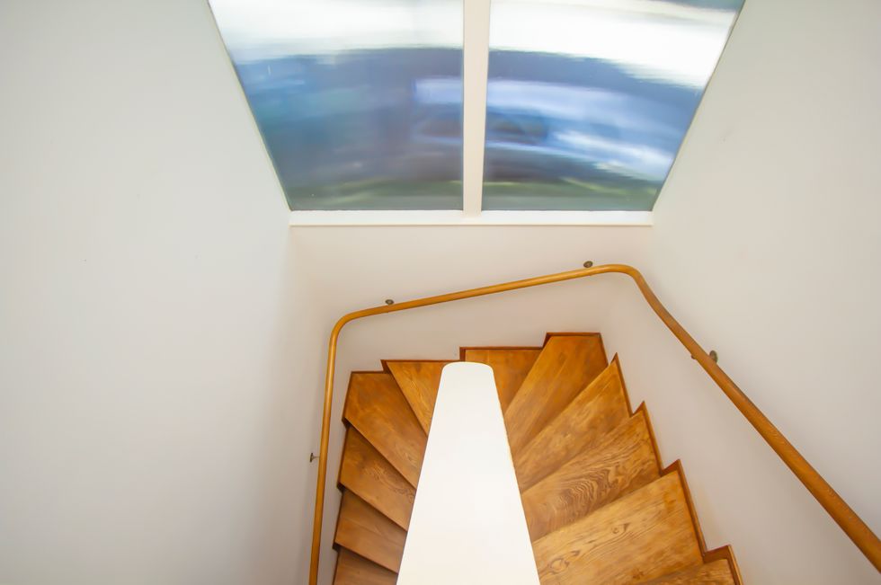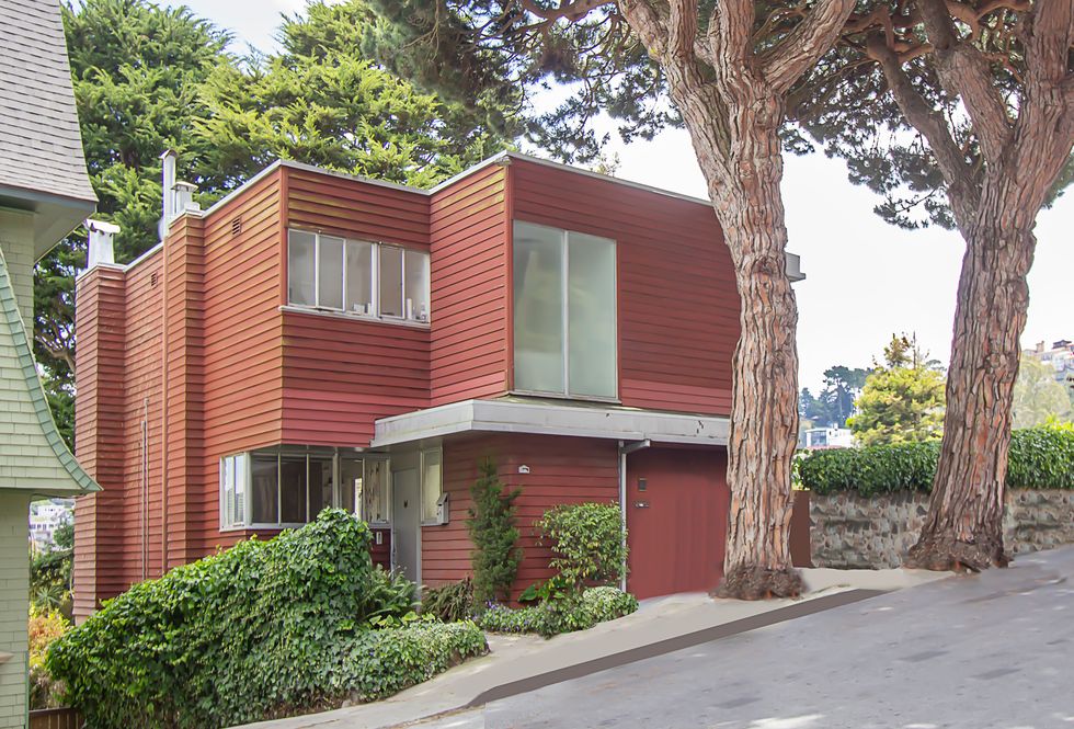 This two-story urban gem in the Inner Sunset is one Neutra's earliest redwood-sheathed houses (his other houses during that period typically employed stucco or metal), built with one-by-six-foot horizontal redwood siding and dotted with steel casement windows in a nod to its shingle-style neighbors on Woodland Avenue. The distinct house, designed with Neutra's frequent collaborator, architect Otto Winkler, sits on a small hillside lot and is made up of two intersecting cubes with a soffit canopy over the entrance.