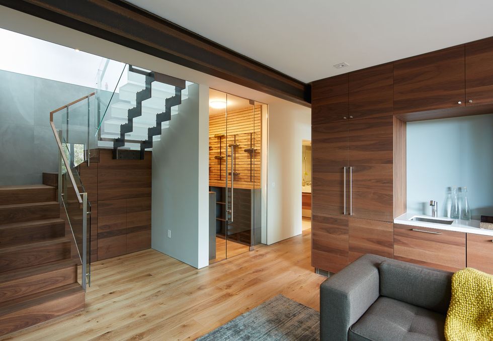 Behind the cooking area, a door opens to one of five bedrooms and a bathroom. Three of the five bedrooms are designed with flexible use in mind—they can be master bedrooms, an in-law unit, home office, or family room. The top floor is meant for entertaining with a wine cellar, a creative space, and even space for a kiddie play room.