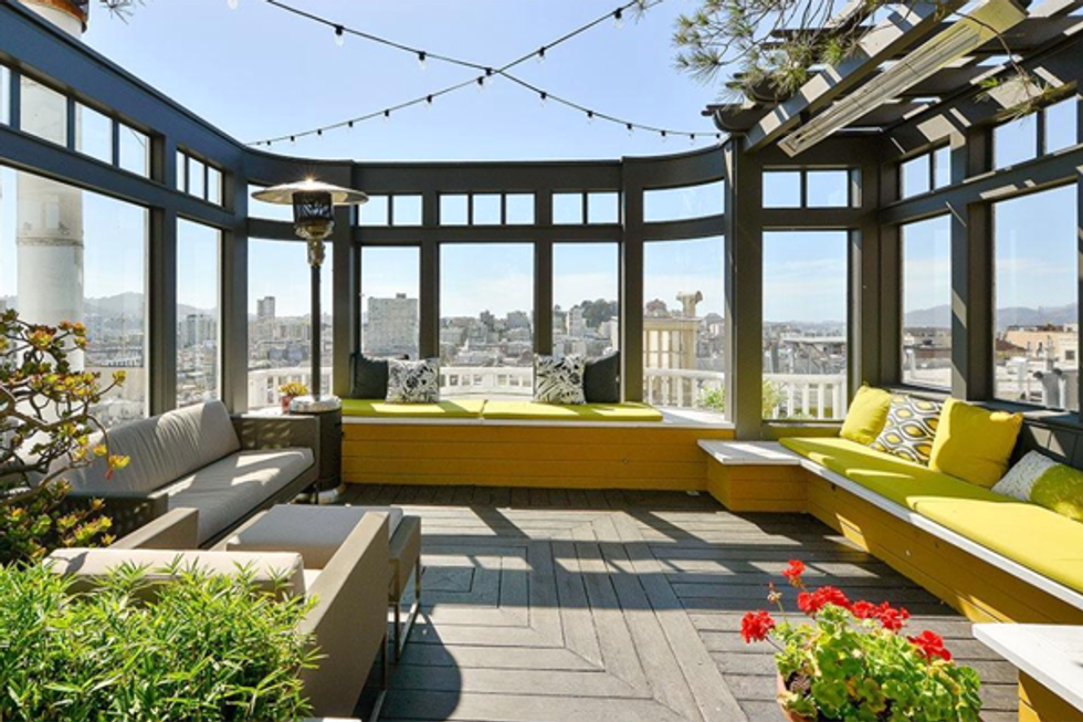 Built in 1988, the modern, two-story house has three bedrooms, two-and-a-half baths, top-floor skylights, two wood-burning fireplaces, and even an elevator. But the rooftop garden is the real star. With overhead heating, a windbreak, and comfy seating, it's the perfect spot to enjoy happy hour while taking in views of the Golden Gate Bridge. You may never go inside again.