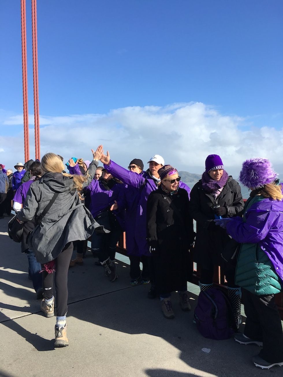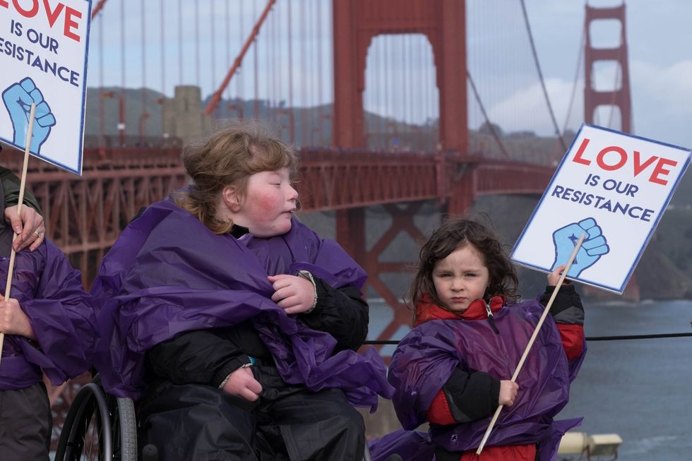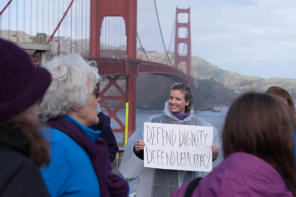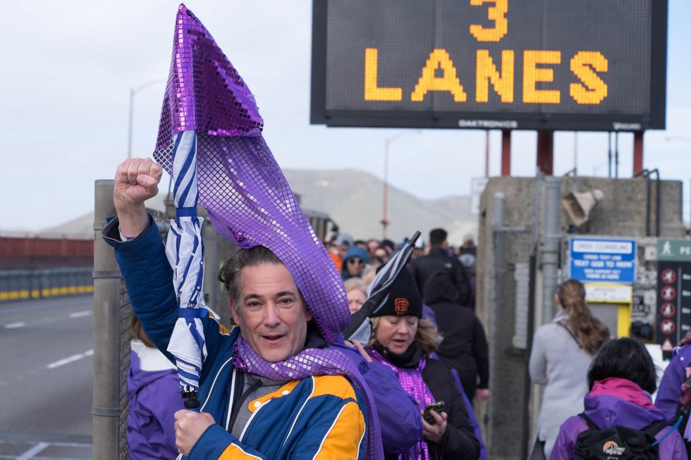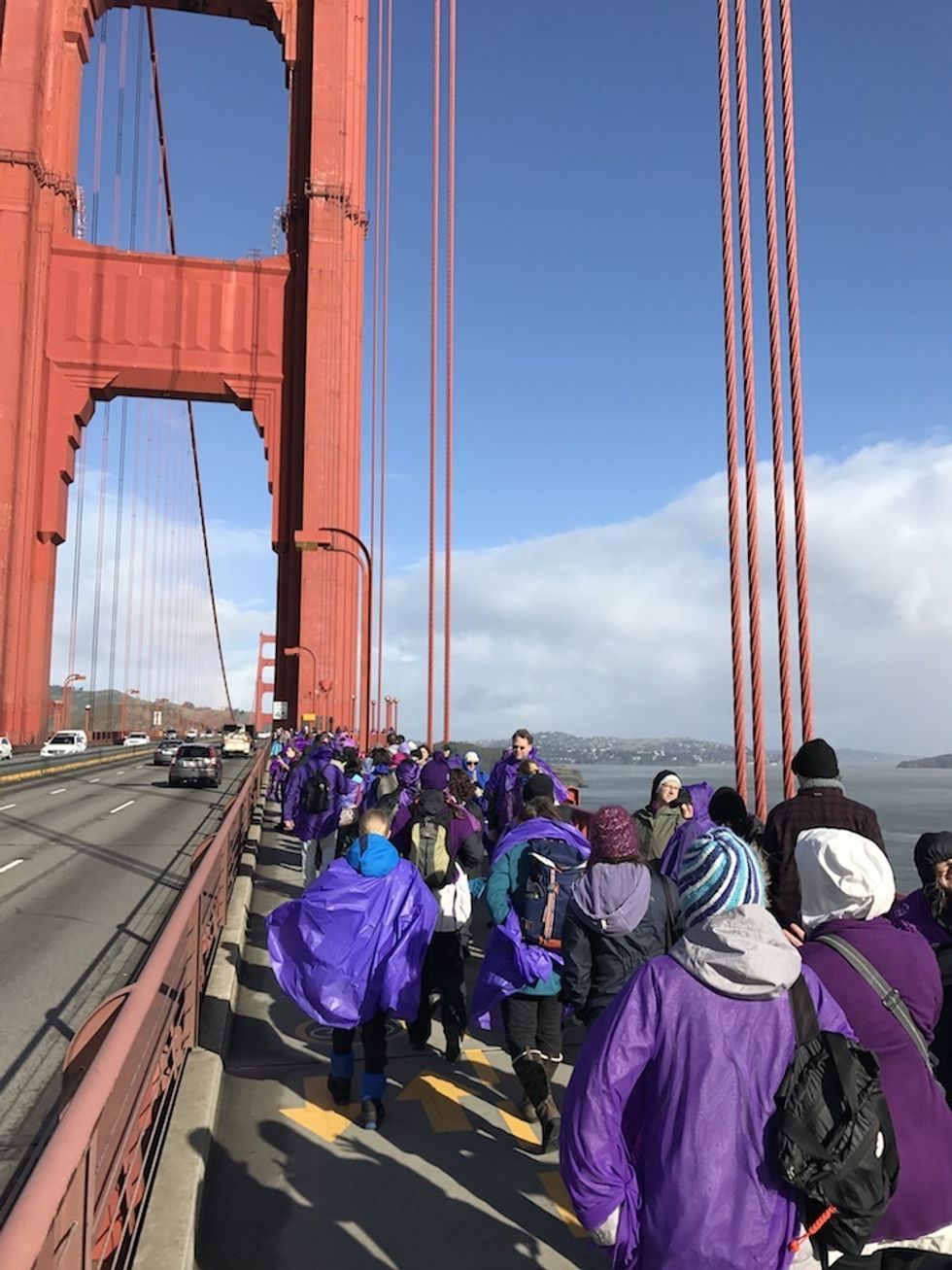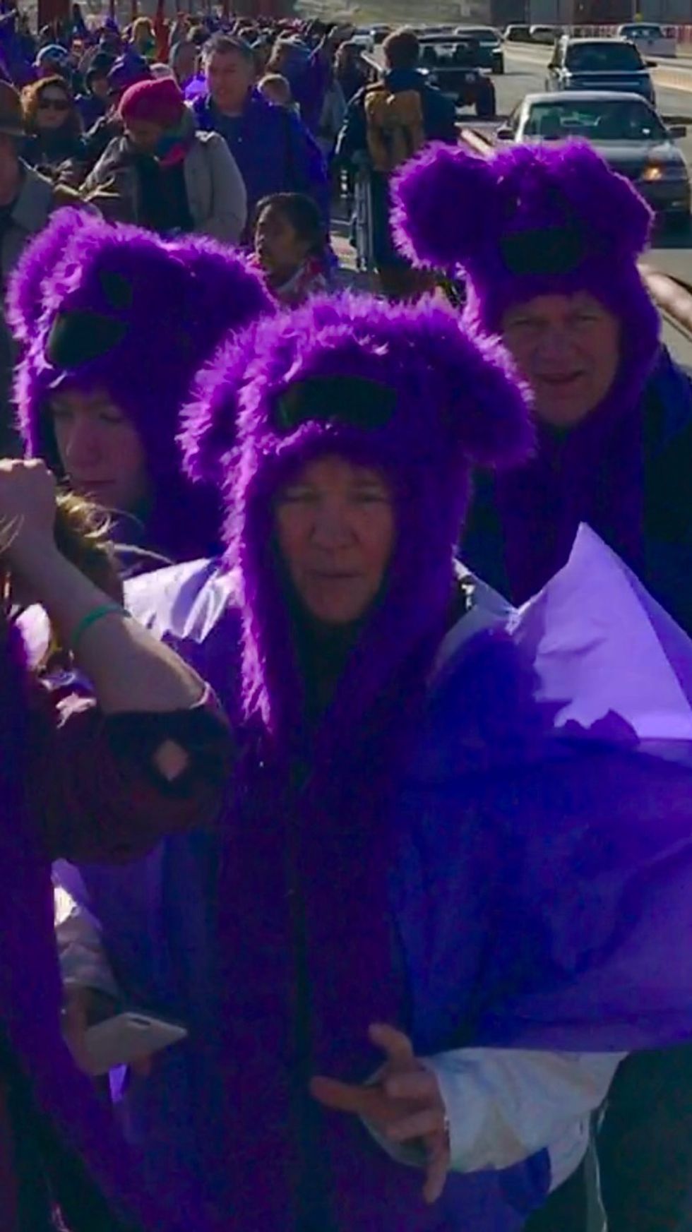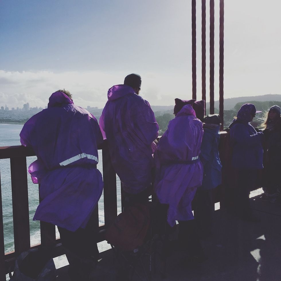 On Friday morning at 10am, some three thousand purple-poncho-clad progressives gathered to form a human chain on the Golden Gate Bridge for Bridge Together, a peaceful demonstration against the new administration. The color of choice was a message against bullying and violence; the vibe of the day: Love Trumps Hate.