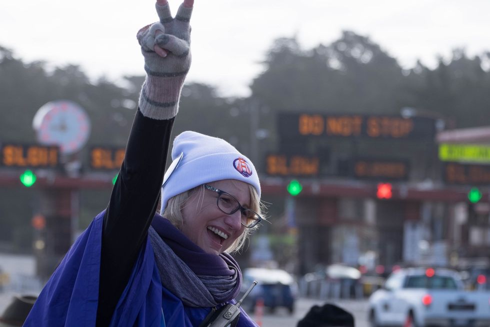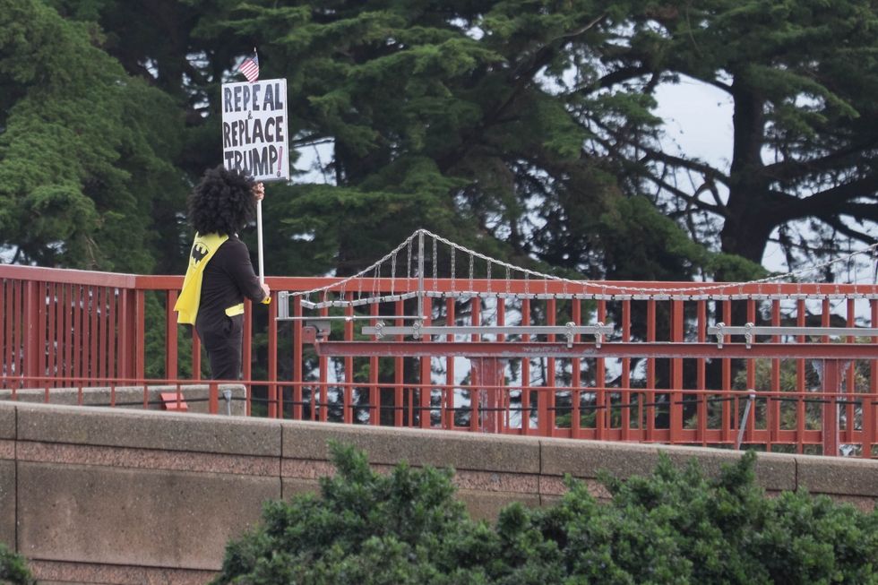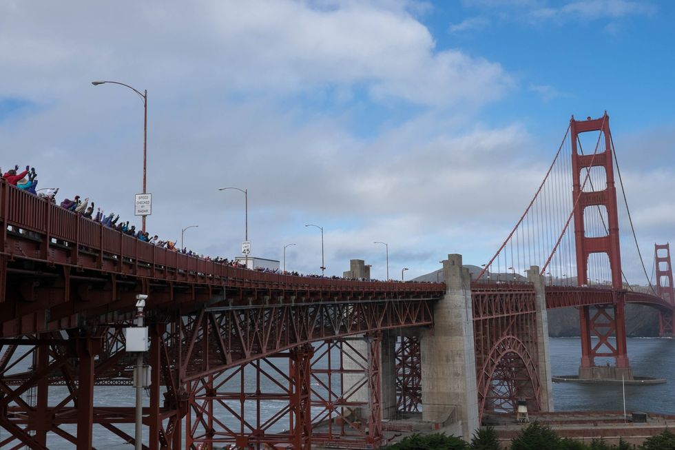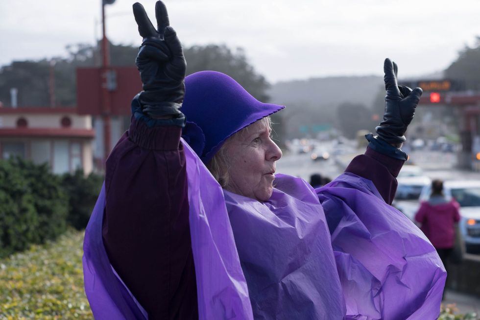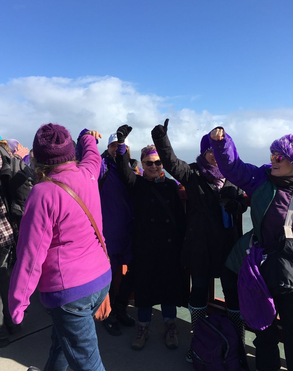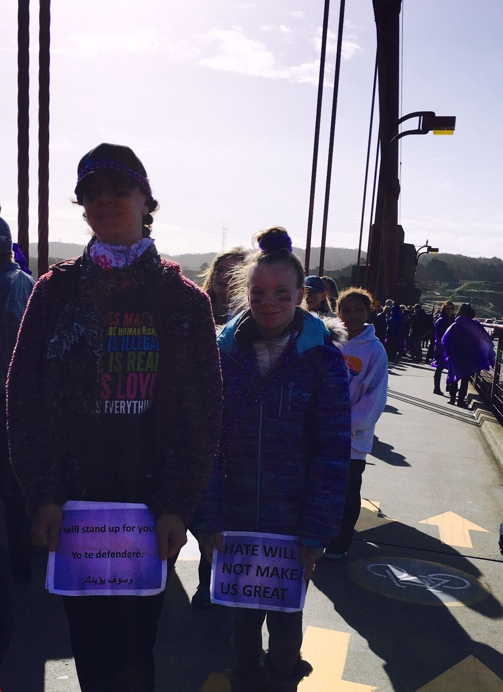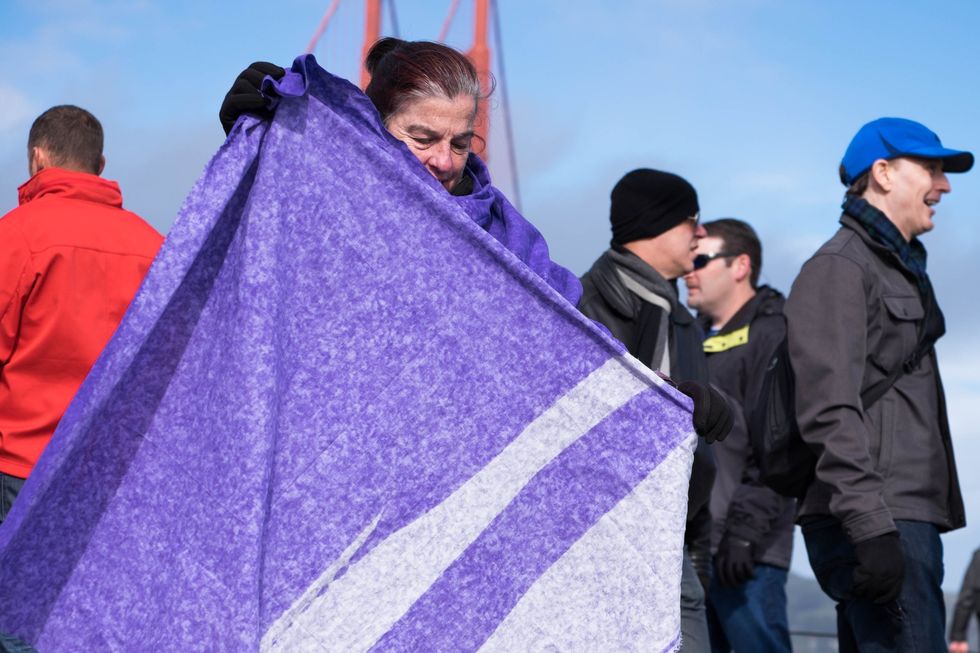 On Friday morning at 10am, some three thousand purple-poncho-clad progressives gathered to form a human chain on the Golden Gate Bridge for Bridge Together, a peaceful demonstration against the new administration. The color of choice was a message against bullying and violence; the vibe of the day: Love Trumps Hate.