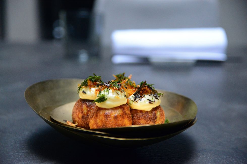 As the next course approached, I immediately thought gougeres. They were in fact æbleskiver, a kind of spherical Danish pastry. Filled with garlic puree and richly seasoned grilled broccoli and topped with garlic mayonnaise, fried shrimp and charred scallions, each was a crispy puff of deliciousness.