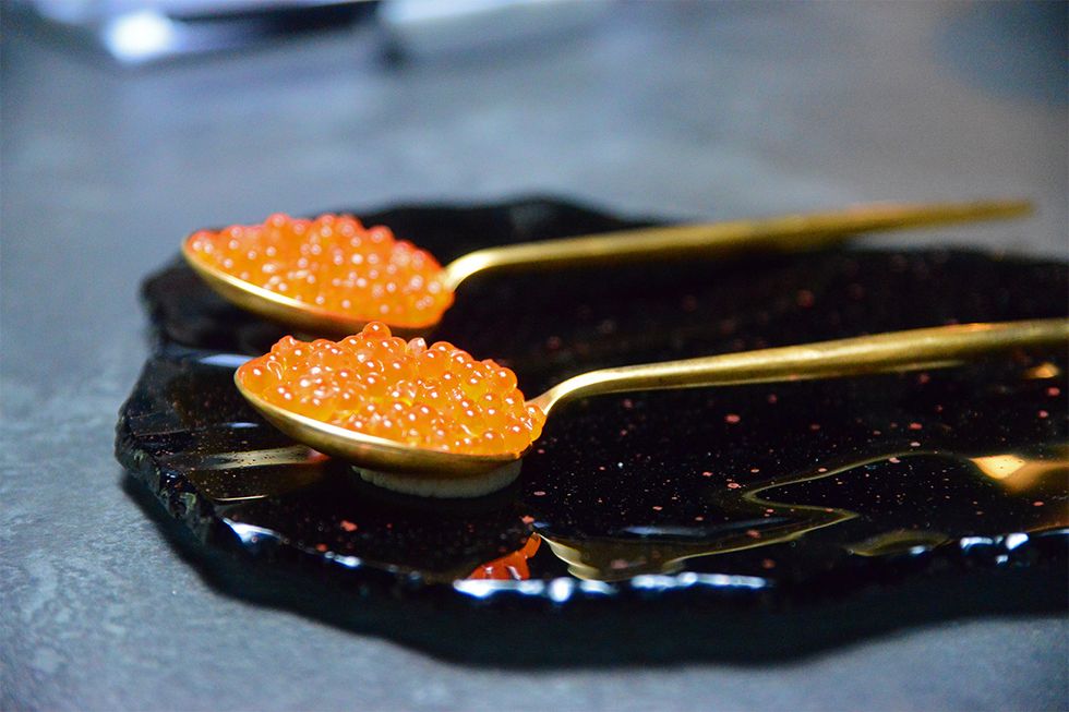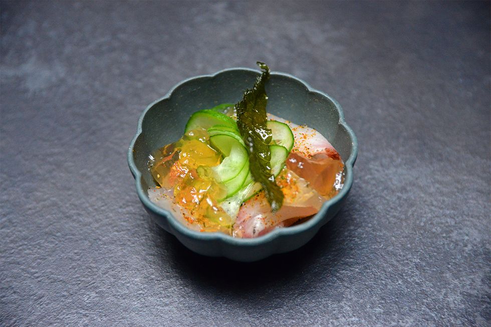 Two long golden spoons appeared, their concavities stuffed with big, gleaming, orangey-red trout roe that had been brined in dashi (a broth seasoned with dried kelp and bonito flakes) and gently smoked. The roe, whose membranes were excitingly firm, popped like incredibly juicy, smoky-salty berries. From fish eggs to fish, we moved on to a delectable dish of aji (Japanese horse mackerel), whose fatty richness was perfectly complemented by a tangy citrus jelly.