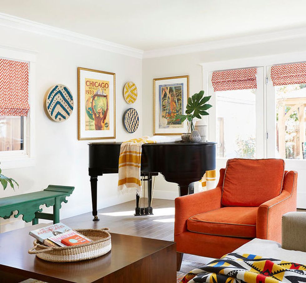 Neuman mixed vintage finds, like the homeowners' orange velvet chair, with new pieces, such as the green Chinese bench, contemporary coffee table and wall-hung decorative baskets. Adding a delightful wave-like pattern without being overwhelming, the orange and white shade fabric was hand-printed using Indian blocks and hand-embroidered.