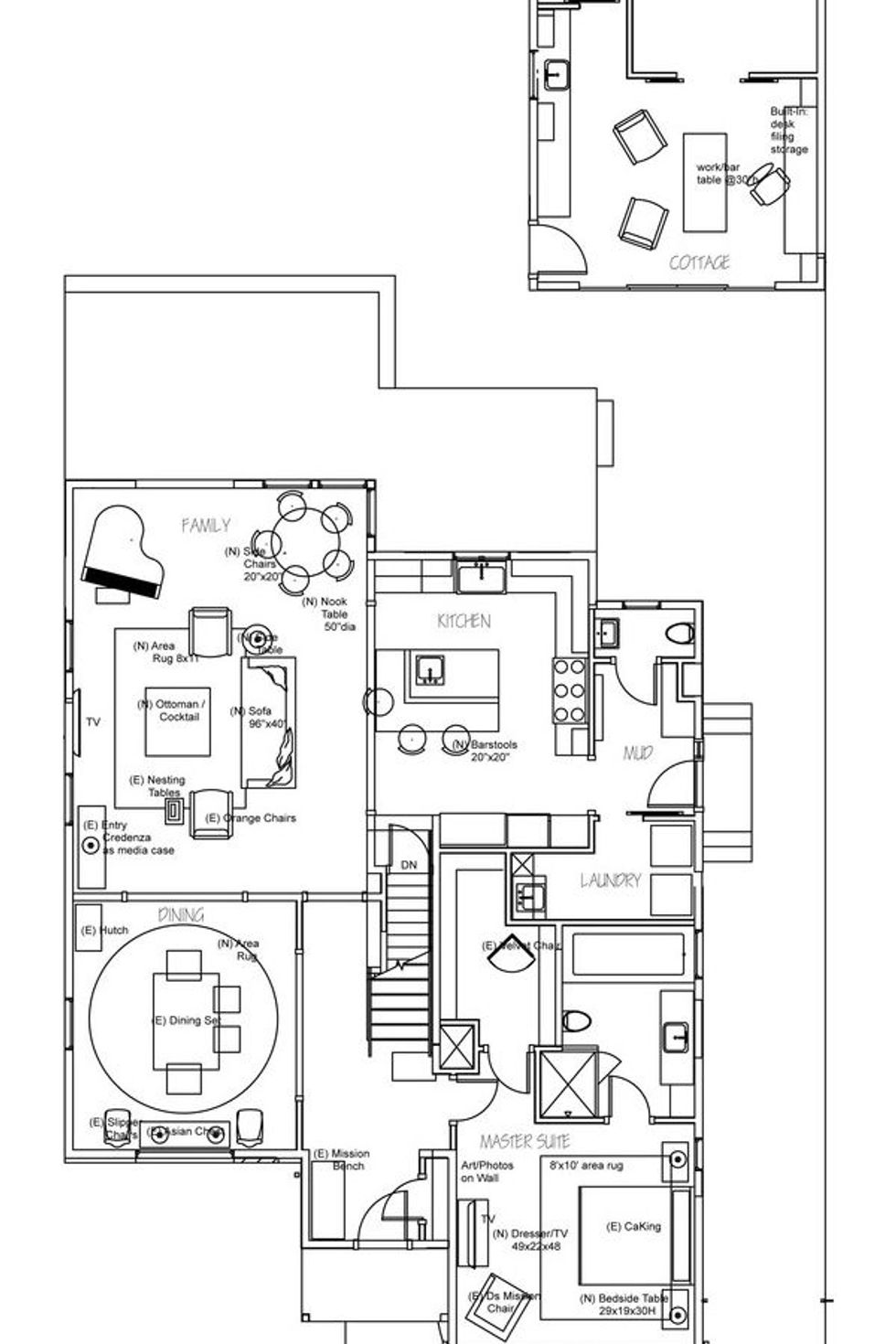A plan of the home's first floor illustrates the new layout. The master bedroom and bath are at the front right, the kitchen at the rear right, the dining room at the front left, and the family room at the rear left. The cottage is at the exterior far right of the home.