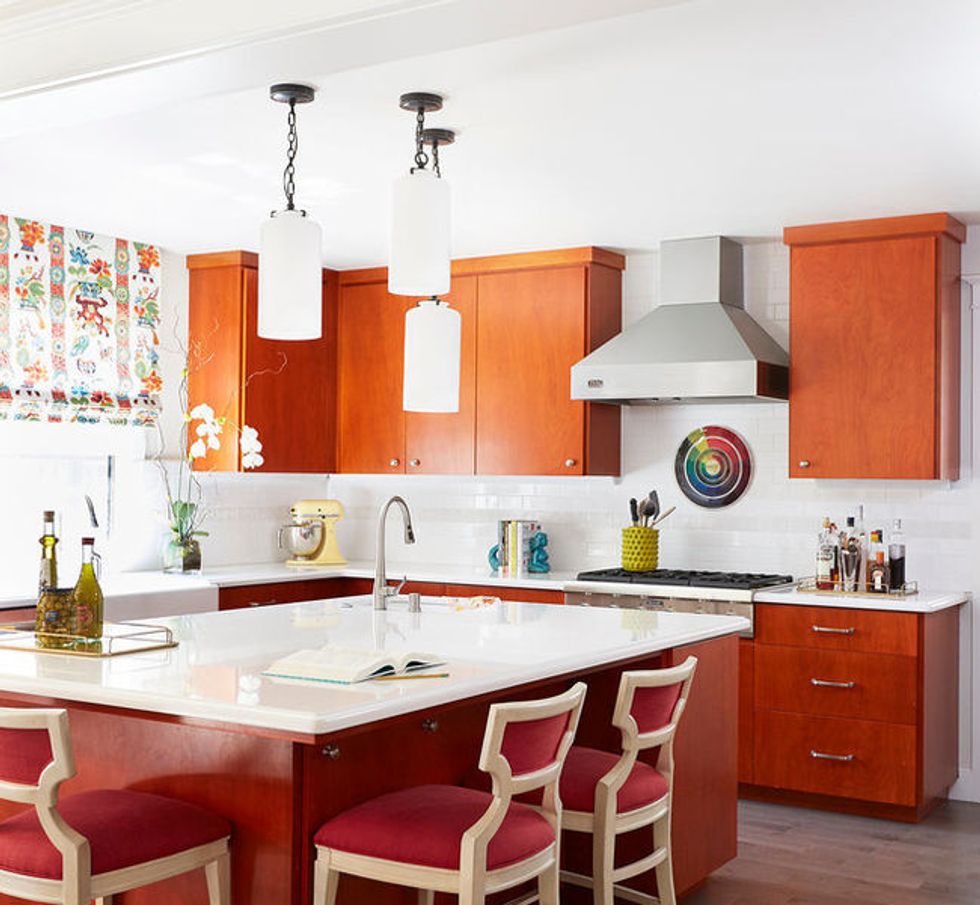 Neuman had these vintage-inspired wood cabinets custom-made to complement the overall project palette of oranges, magentas and reds with touches of greens and blues. She selected the playful, multicolored shade fabric to tie it all together.