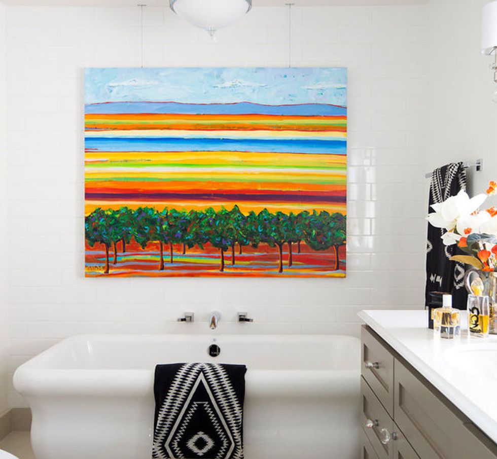 A vibrant Tim Collom art piece hangs from the ceiling above the bathtub, allowing the homeowners to avoid drilling into the subway tile on the wall.