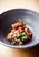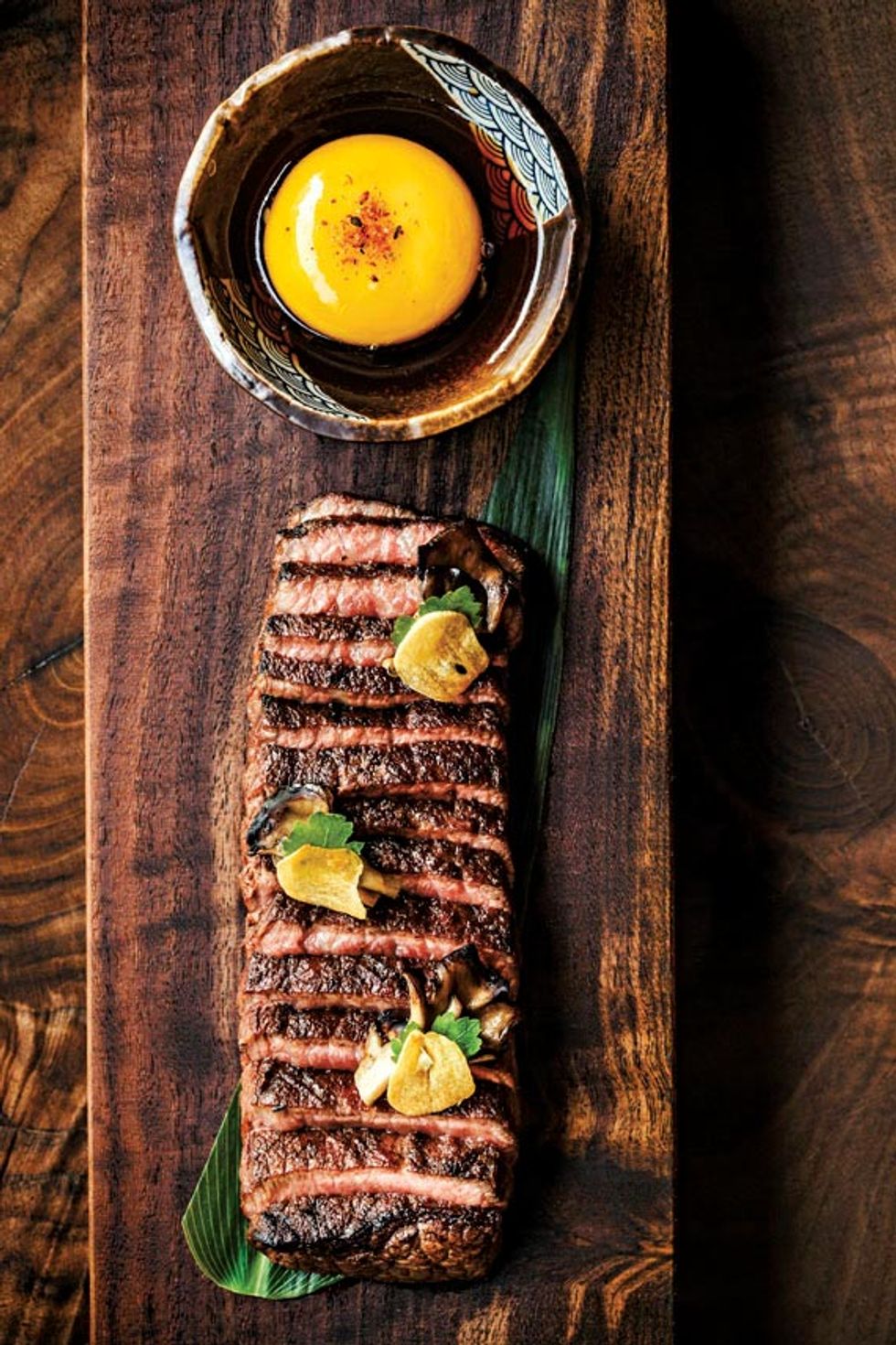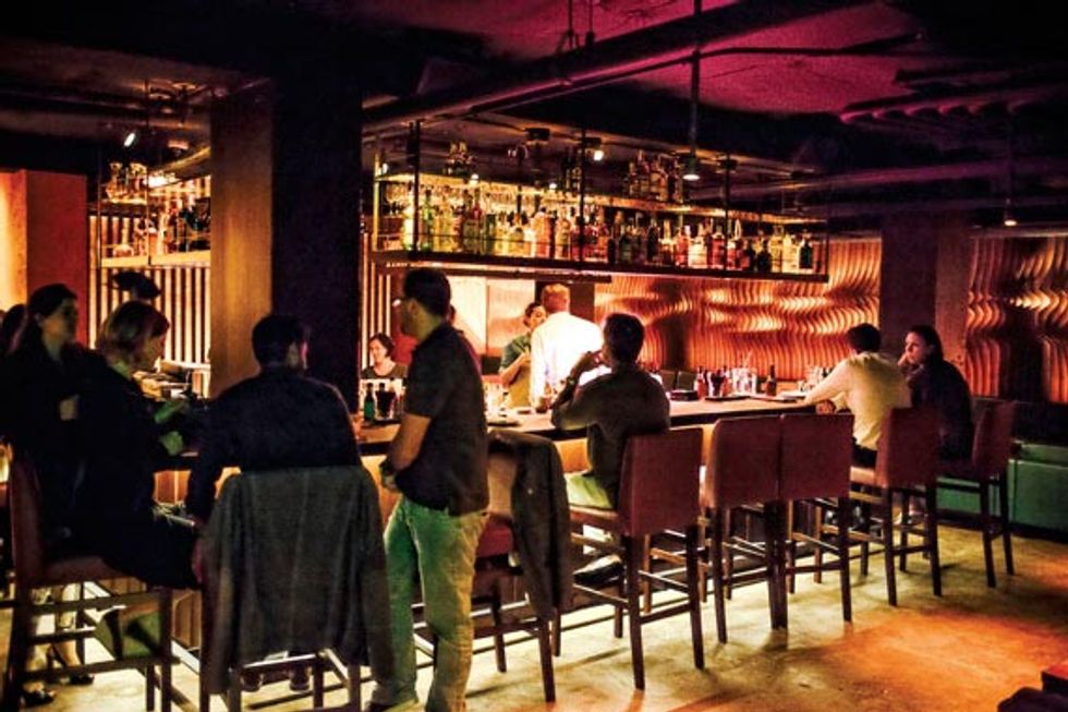 Stepping inside is akin to arriving at an underground nightclub, where black walls are punctuated with clusters of pinhole lights and a glowing staircase. Past a slatted wood wall, the dining room is contemporary and spare, with bare wood tables, concrete floors, and a chill soundtrack and modern textural walls that set the stage for the fun, fusion-like dishes coming from the fiery robata grill stations and open kitchen.