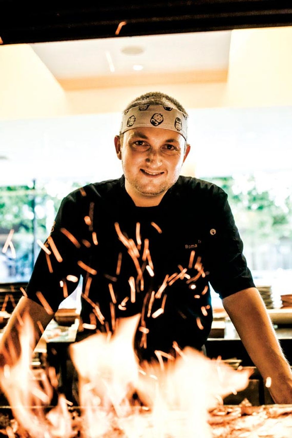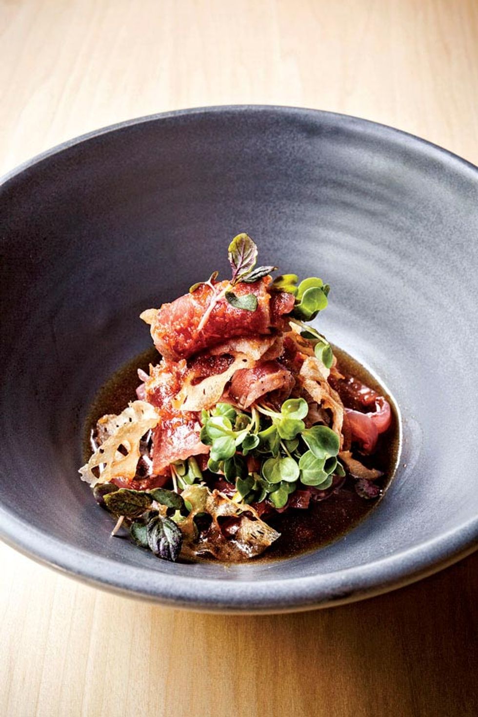 It is here that chef Roman Petry, who cut his teeth in the Michelin-starred kitchens of Europe, is crafting a menu that means to surprise and satisfy a variety of tastes. His appetizer of butterfish tataki is wrapped around spears of white asparagus and dressed in yuzu. Other standouts include a cheeky combination of chicharrones with fresh Mendocino uni and an impressively huge, sweet Madagascan tiger prawn that’s grilled and served like lobster in a split shell with yuzu koshu chili and lemon.