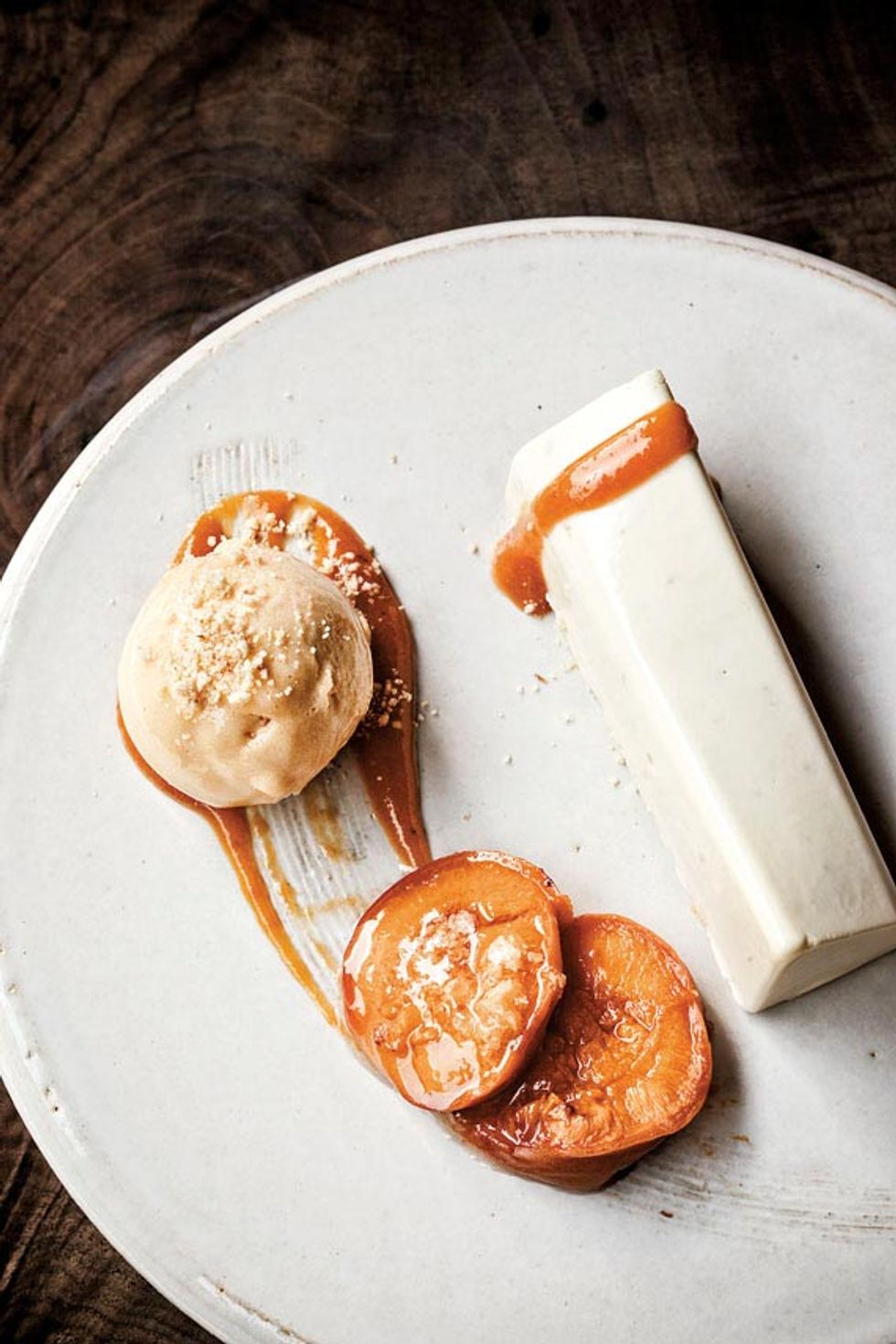 Twice weekly, unusual items such as white tuna and hamachi belly are imported from Tokyo’s Tsukiji market to become lavish sashimi presentations at the deft hand of sushi chef Mike Lim (formerly of Morimoto Napa). Meanwhile, pastry chef Alexander Ruiz (Redd) turns out jubilant, birthday-worthy desserts. His frozen creations—like an apricot-vanilla usugiri (right) with roasted fruit, or the punchy yuzu “snowball” with coconut and summer berries—are especially memorable.