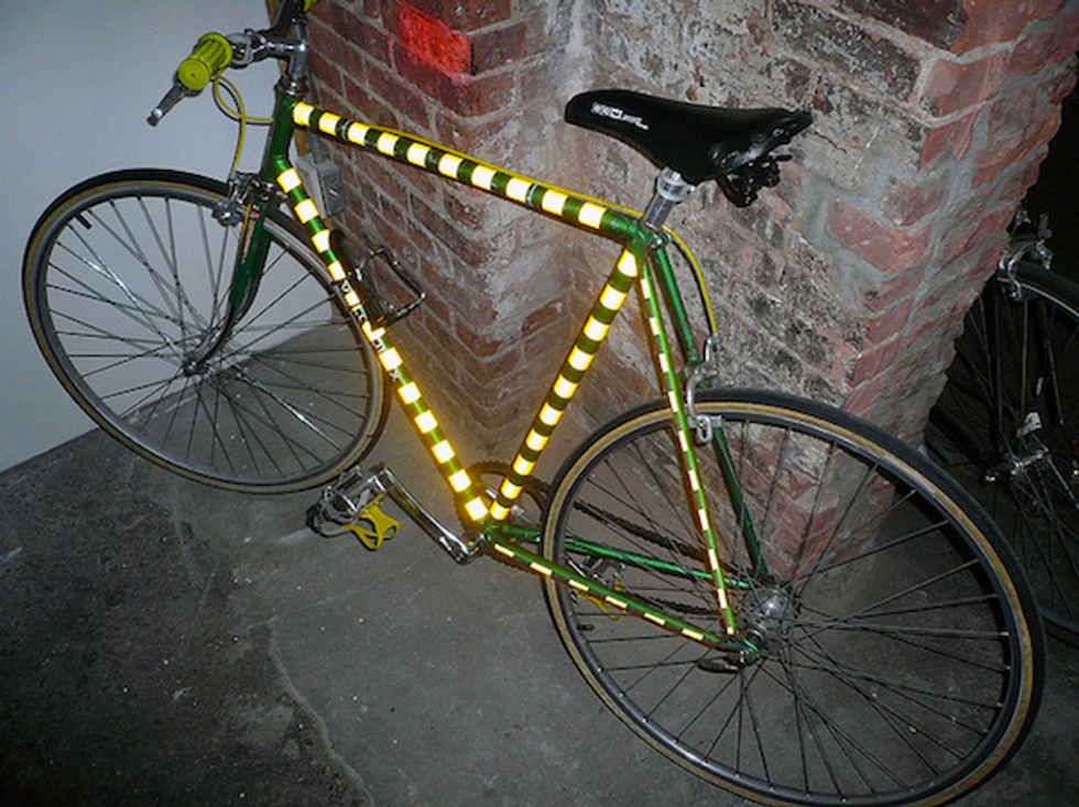The simplest approach is via BikeWrappers ($45). This system features highly reflective pieces you can wrap around your frame. By day, they're decorative, but once headlights go on, they are blinding accident blockers. They are reversible and easy to remove and come in an array of prints and colors. They are visible from a quarter mile away from car headlights and also protect your bike from scratches and grime. Go big with neon, or go minimal with white.