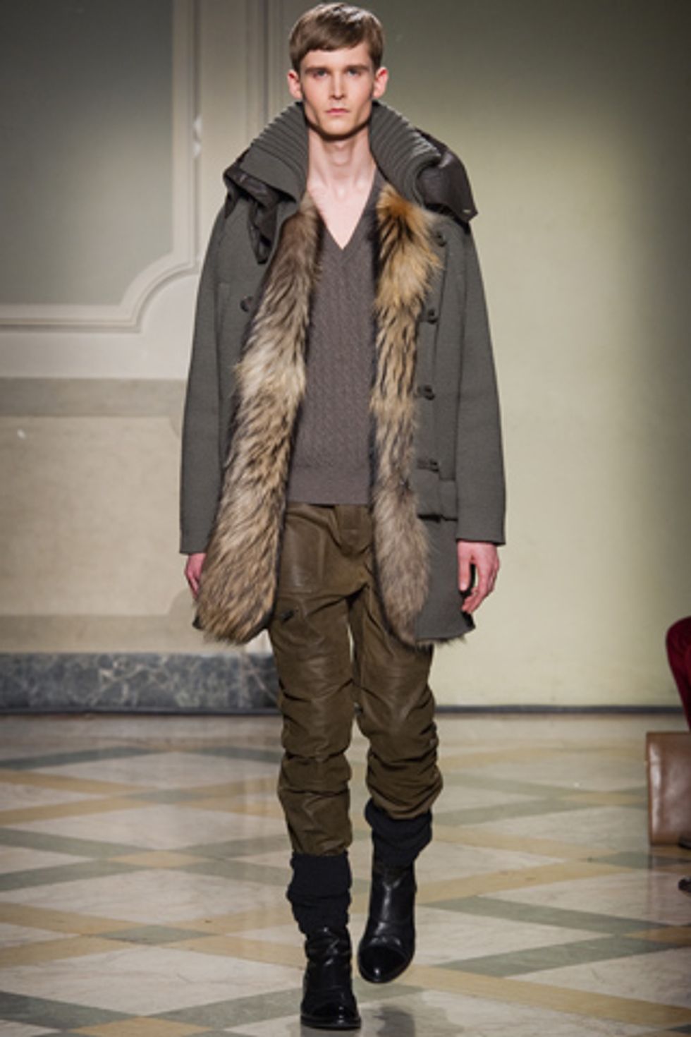 The Amsterdam-based fashion house of designers, Viktor Horsting and Rolf Snoeren, is notorious for their theatrical, flamboyant design. The menswear line, "Monsieur" was added in 2003, and is actually more scaled back. The Fall 2011 collection is sharp with plenty of modern suiting. The outwear ranges from thick, black leather shearling jackets, to modern, well-layered wool peacoats, both in a variety of lengths. A majority of the collection is in grayscale, with a bit of winter tan and a few plaids thrown in for good measure.