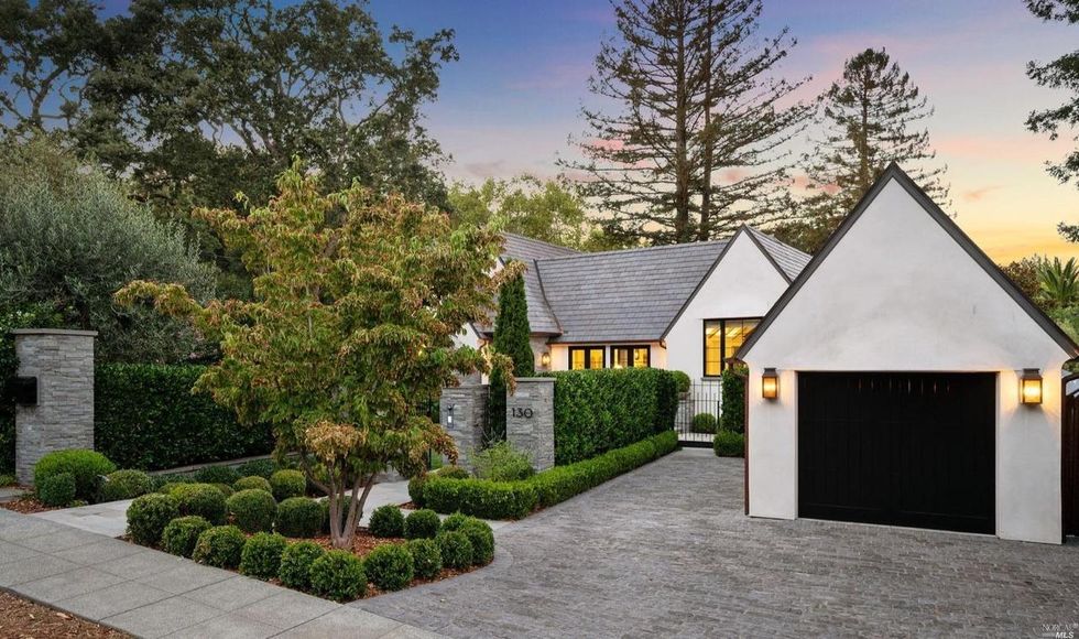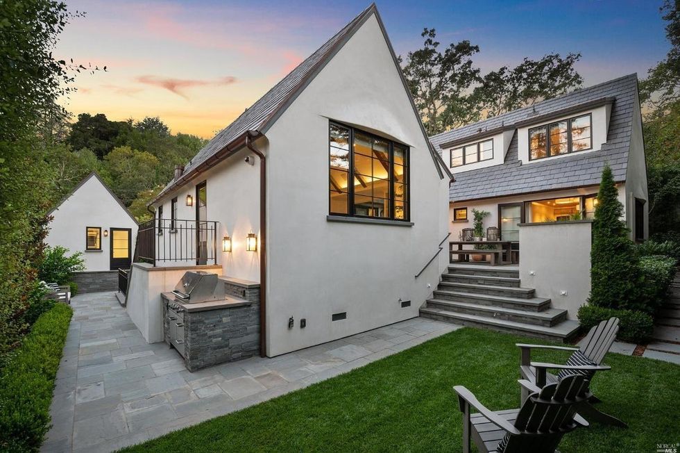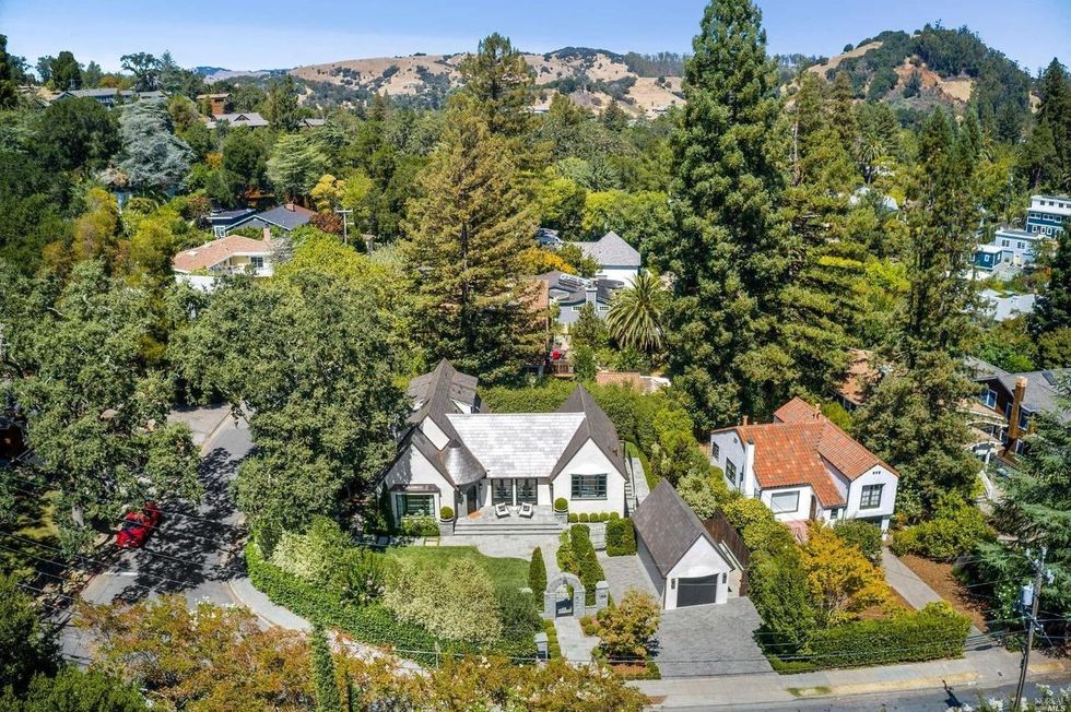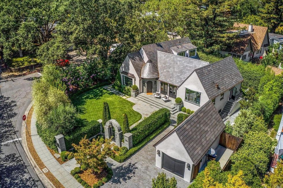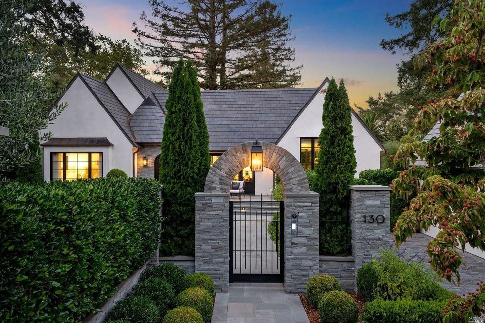 This Marin County home on a verdant property in San Anselmo is swoon-worthy from the start thanks to a charming arched entryway and a front lawn with formal box hedges and ball shrubs.