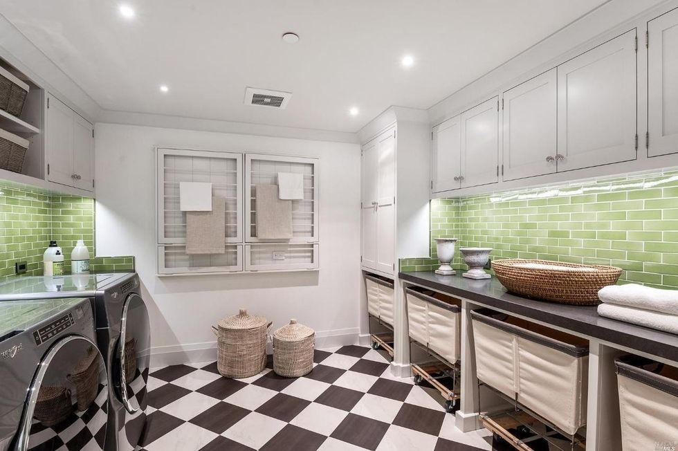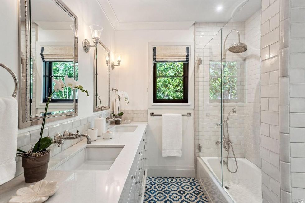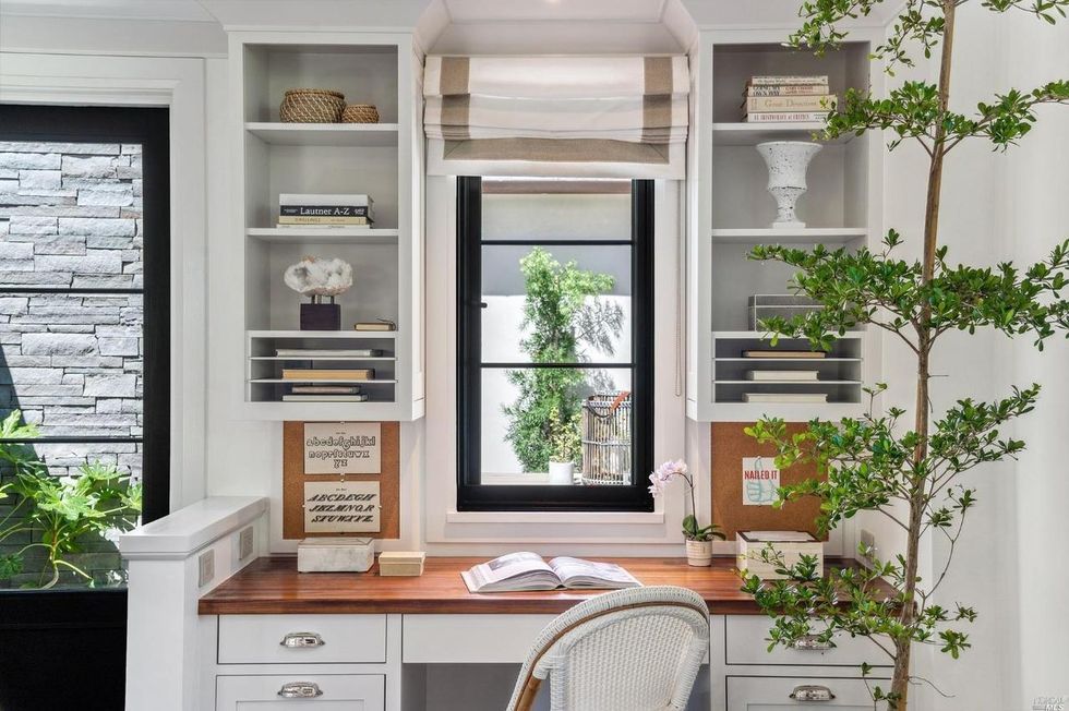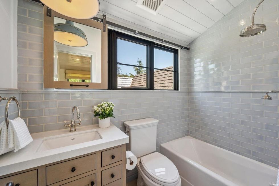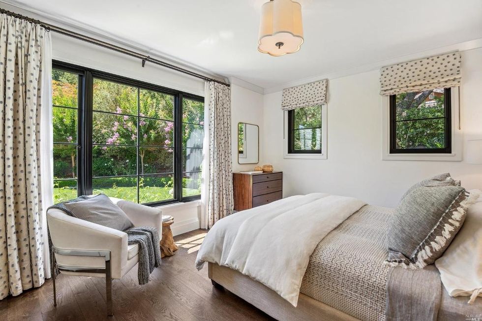 This Marin County home on a verdant property in San Anselmo is swoon-worthy from the start thanks to a charming arched entryway and a front lawn with formal box hedges and ball shrubs.