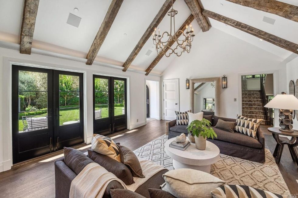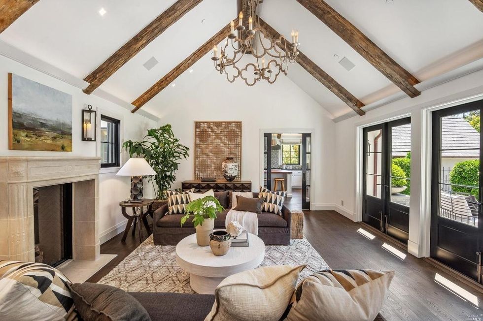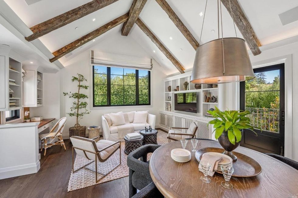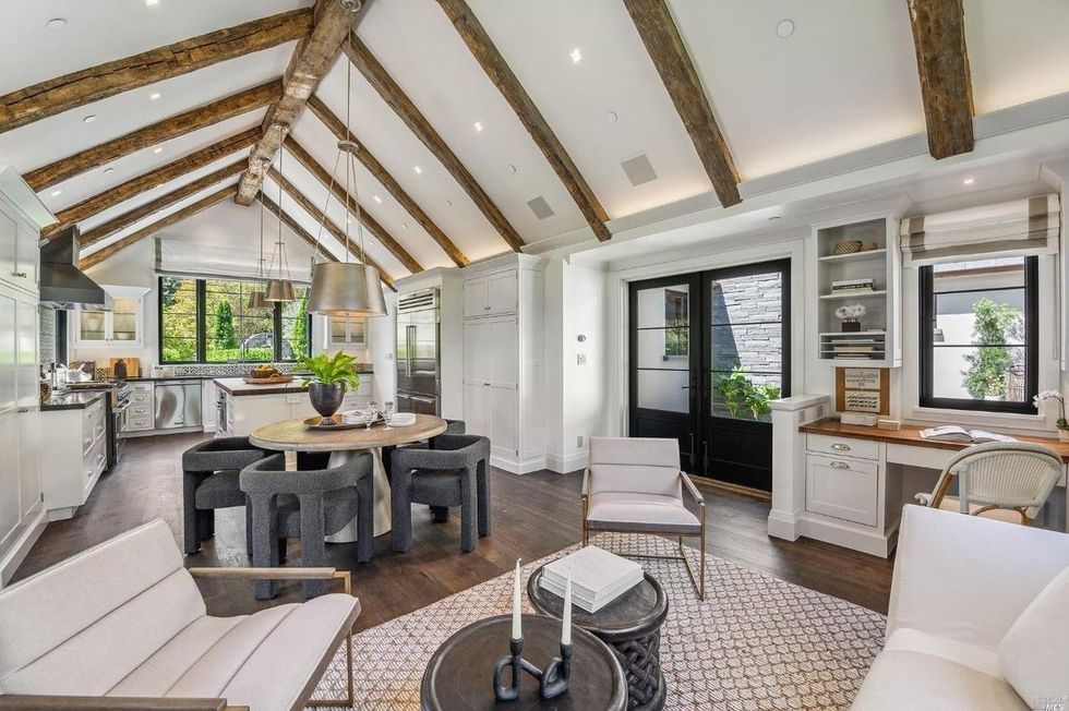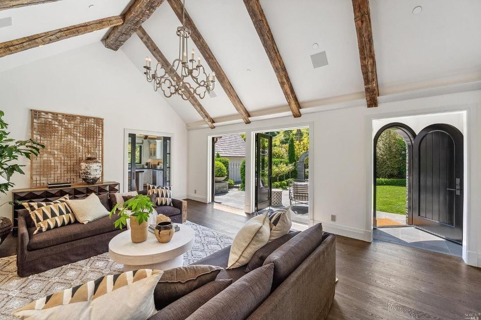 Set back across the bluestone cobbled driveway, the 3,500-square-foot-home has a quaint farmhouse-style facade with a storybook pitched roofline, myriad large windows, and an arched front door that opens to an interior with towering ceilings with exposed reclaimed wood beams. White oak flooring underfoot keeps the palette bright.