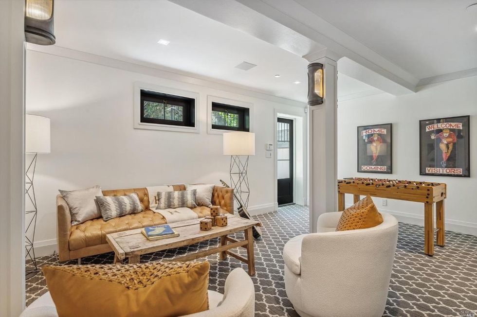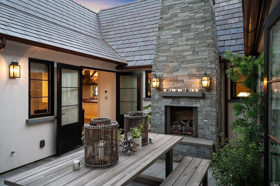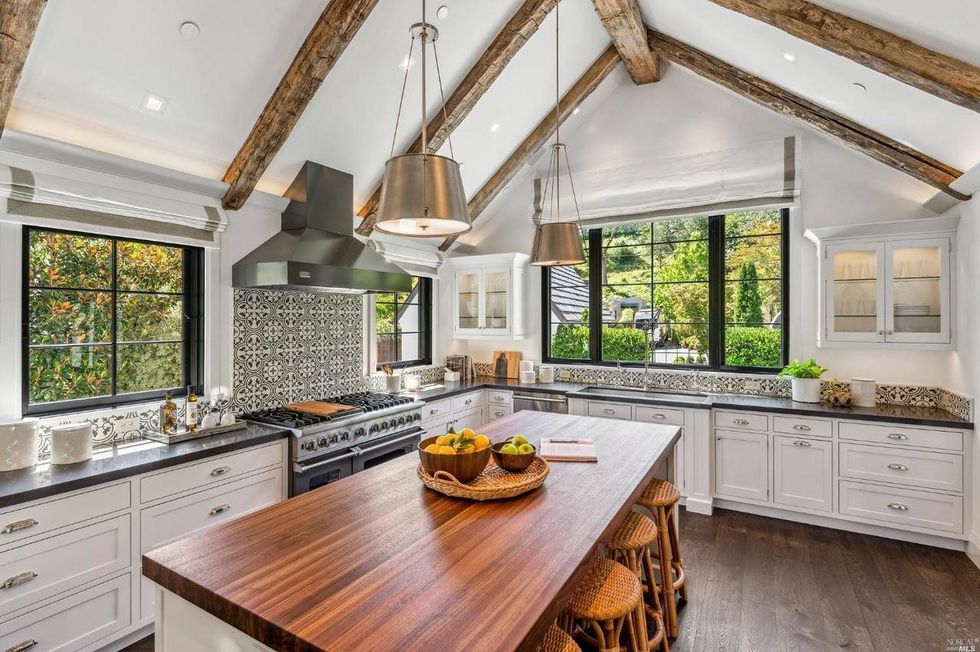 Enter into the living room which is anchored on one side by two pairs of French doors that open to the yard and by a lovely carved stone fireplace on the other. Pocket doors transition the space into the kitchen which has bright natural light, a Spanish-style tile backsplash, and a large island with a butcher block top. This area is cozy for family time and entertaining with a small adjacent dining area and a sitting room that opens up to a patio with stone fireplace.