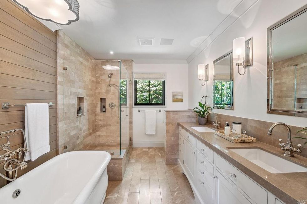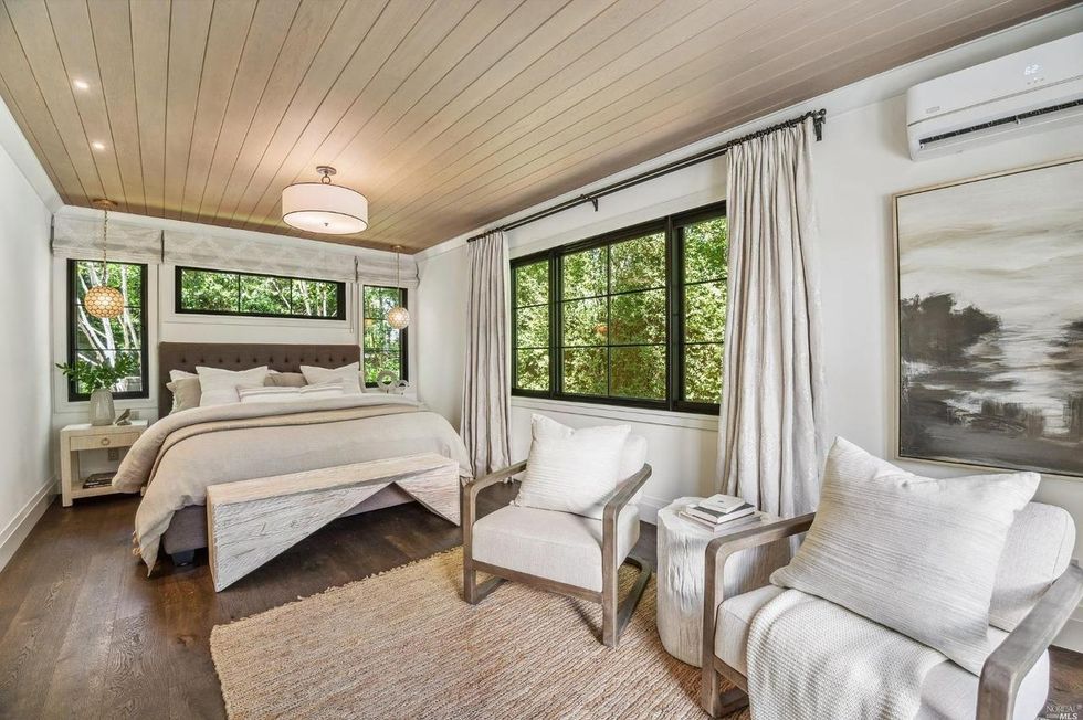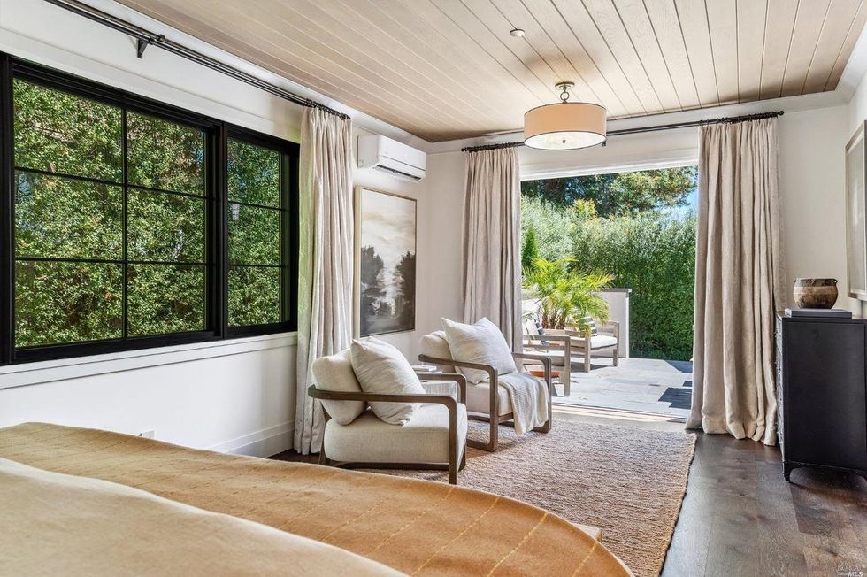 The primary suite resides on the main level beneath an oak-paneled ceiling with black-framed windows. Immersed in lush views, the space feels more like a treehouse even though it is situated on the ground floor; it does open to a patio through a pair of double doors. The master also has a spacious walk-in closet and bathroom with standalone soaking tub and dual sink vanity.