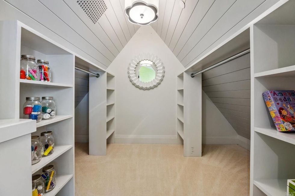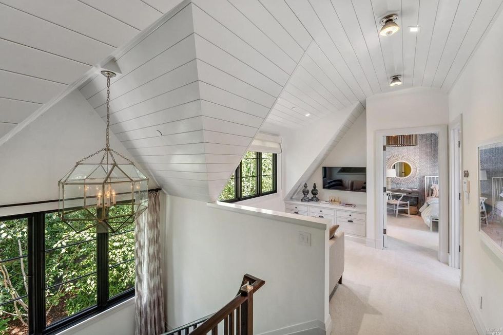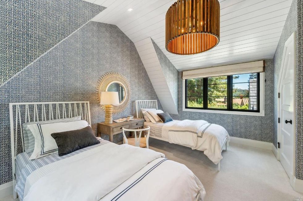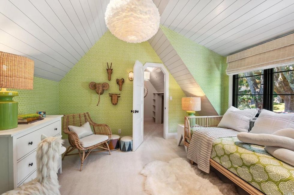 Upstairs, two bedrooms share a luxe bathroom, a play area, and walk-in closet. Both rooms have plenty of character with white wood-paneled ceilings, whimsical patterned wallpaper, and a treetop view.