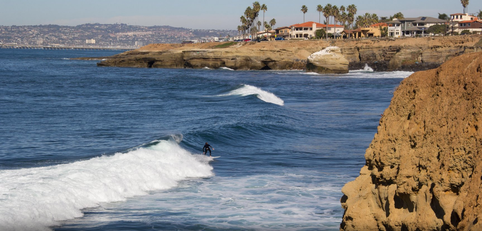 Just south of the more heavily trafficked La Jolla Cove is a small and unassuming shoreline with lots to see. The smooth rock formations at Nicholson Point Park contain pits, faults, and crevasses that host tide pools and provide resting places for many sea birds. Parking is less crowded along the residential Coast Boulevard than it is in the commercial area to the north. Look for the stairway down to the sandy beach, or maneuver down some sandy trails. Although most of the shore is rocky, there are some soft sandy areas which befit a spread blanket and picnic. If lounging or exploring tide pools isn't your thing, there are also options for surfing, swimming, and scuba diving. Take care to watch the surf, as the rocky shore can be dangerous for the inexperienced. Other activities include fishing and photography; the sunsets from this beach are phenomenal.