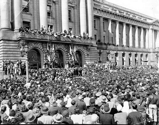Ten thousand San Franciscans Gathering Together in Front of City Hall to Hear a Speech from President Harry Truman (1948)
