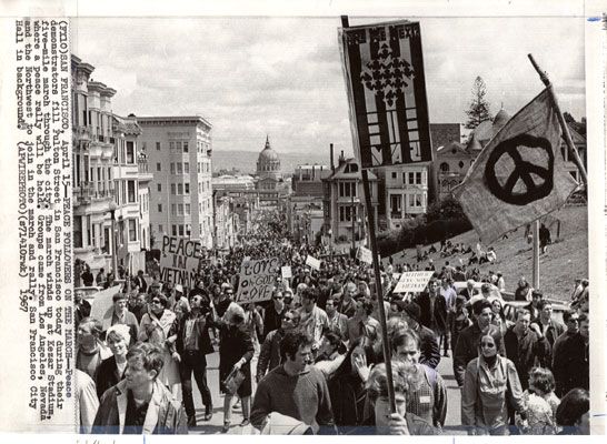 Peace Demonstrators Protest the Vietnam War With City Hall in the Background (1967)