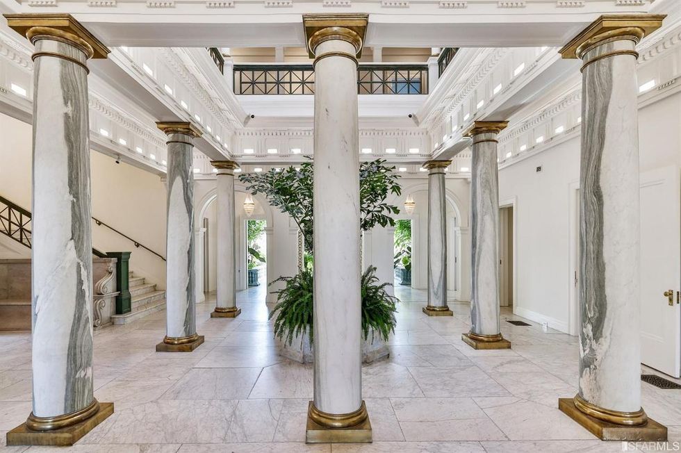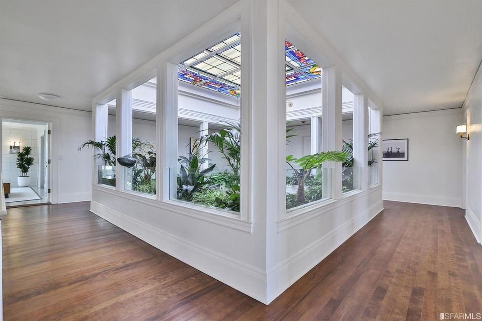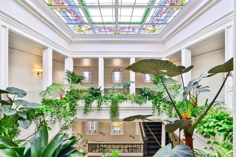 You'll enter the main level via a round foyer, swathed in marble on the floors and walls, with Grecian-style columns, French doors peek at indoor gardens, and a dramatic domed ceiling. Once inside, a three-story central atrium with a stained-glass windows and skylight is residence's crowning moment.