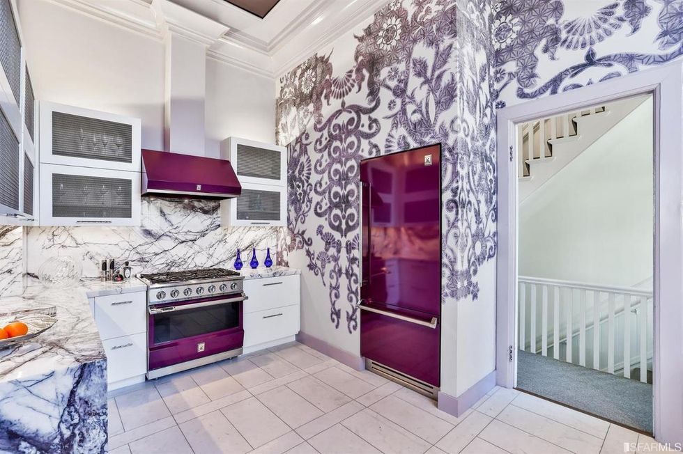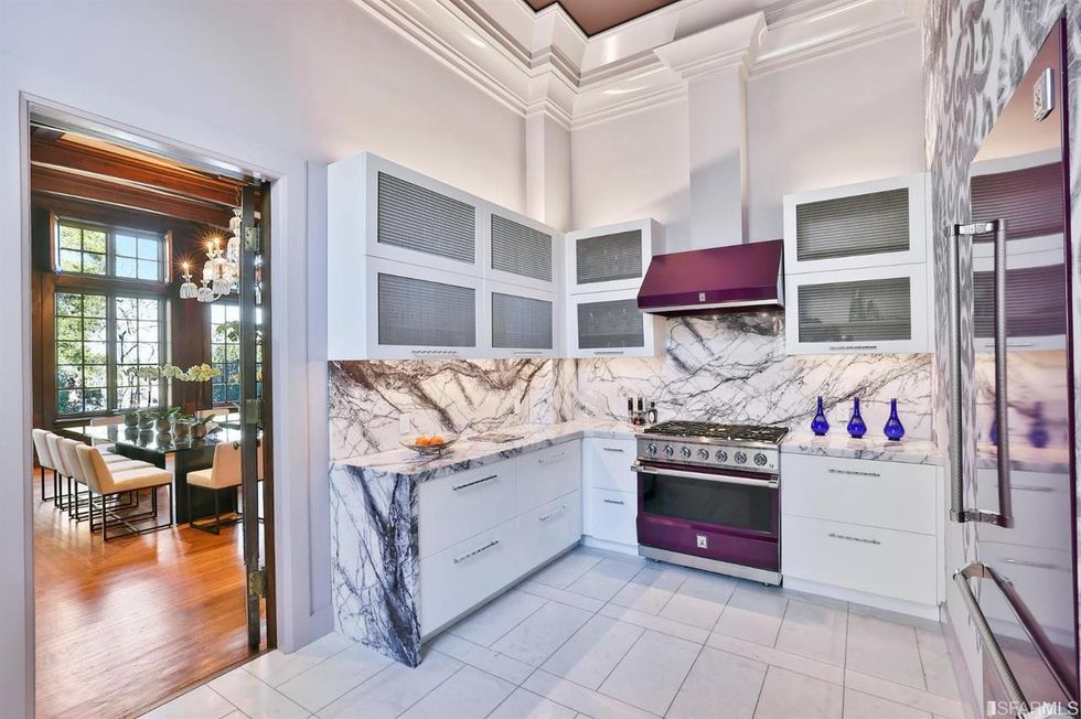 The gourmet kitchen feels both modern and ladylike with Lilac Quartzite countertops and pops of rich fuchsia on the commercial Hesta appliances. There is also a large catering kitchen and butler's pantry with two of everything—refrigerators, dishwashers, ovens, and sinks—on the lower level.