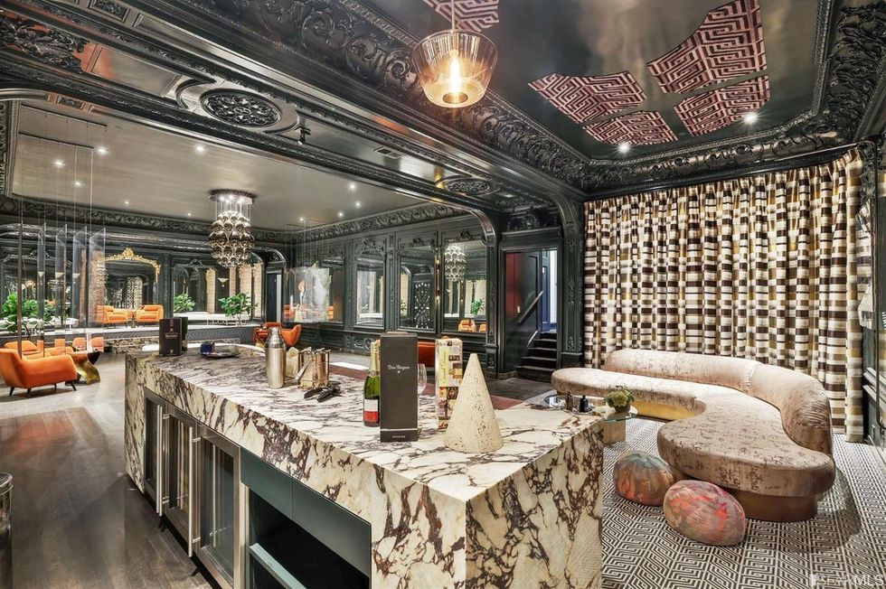 There are countless pretty spaces here, but second only to the atrium is the lower level's original Hall of Mirrors–inspired ballroom, which has been updated as a modern nighttime lounge with a Calacatta Viola marble bar complete with inset lighting and under-counter wine storage and refrigeration.