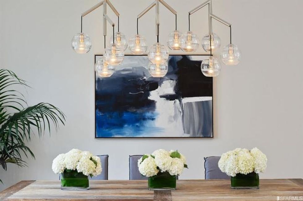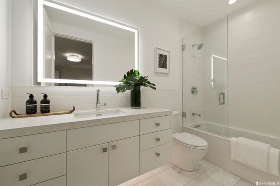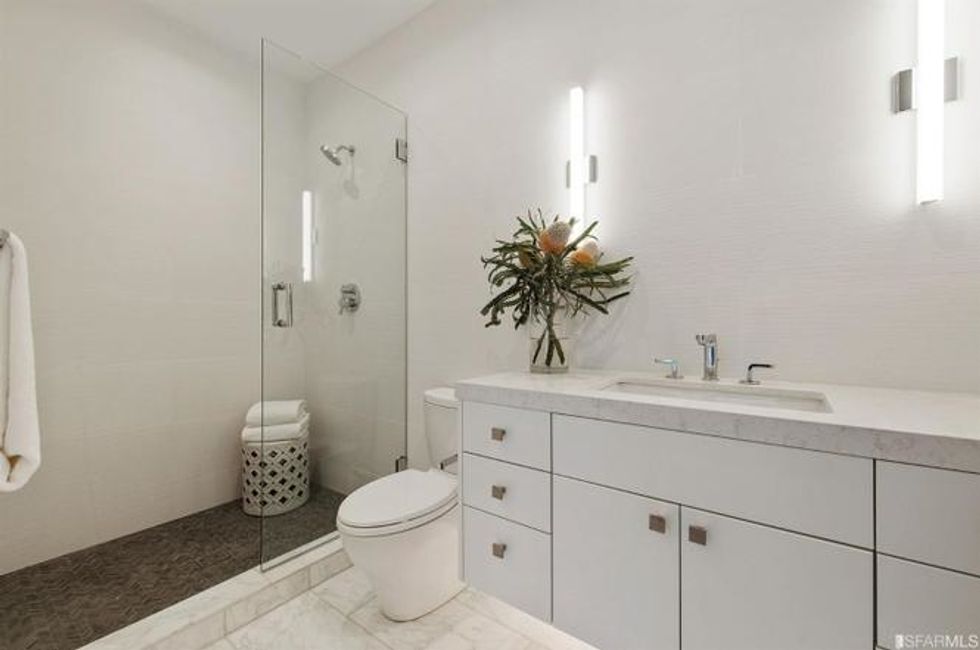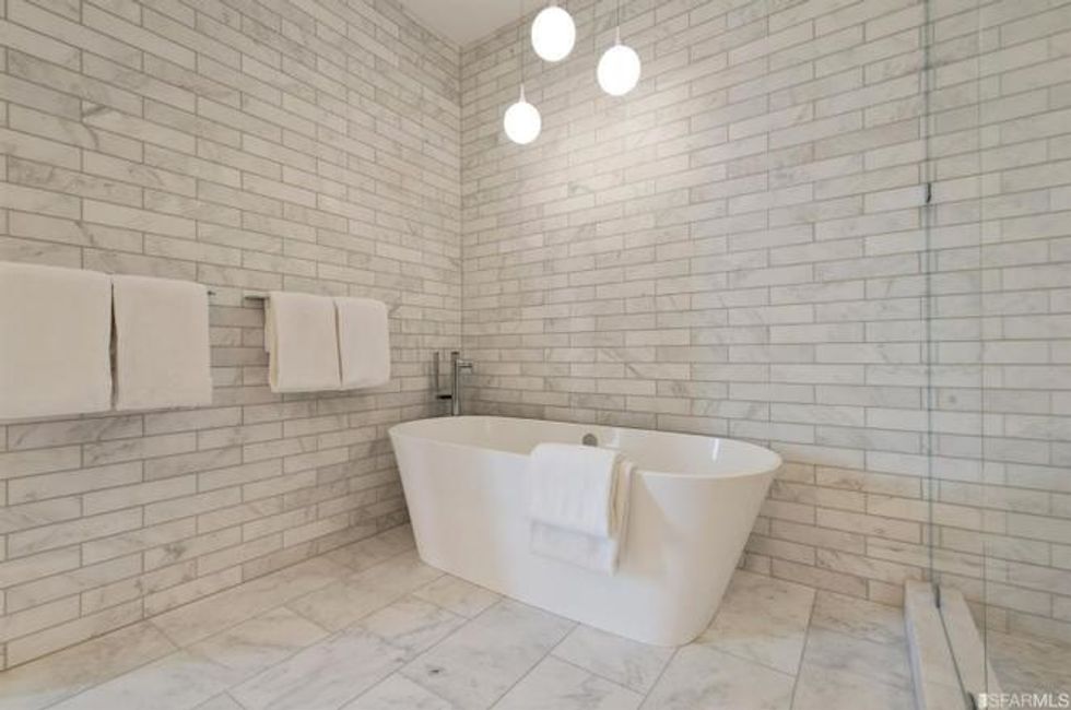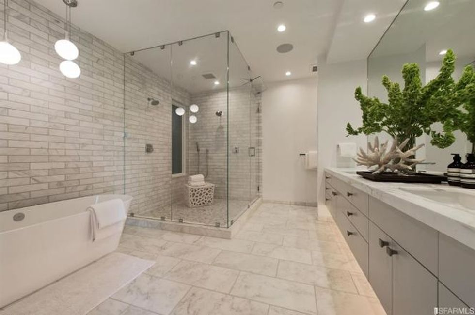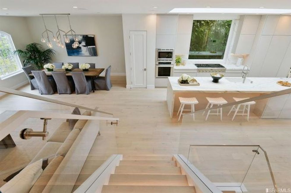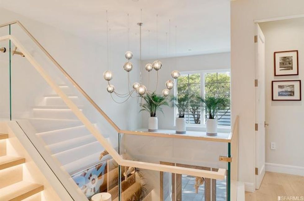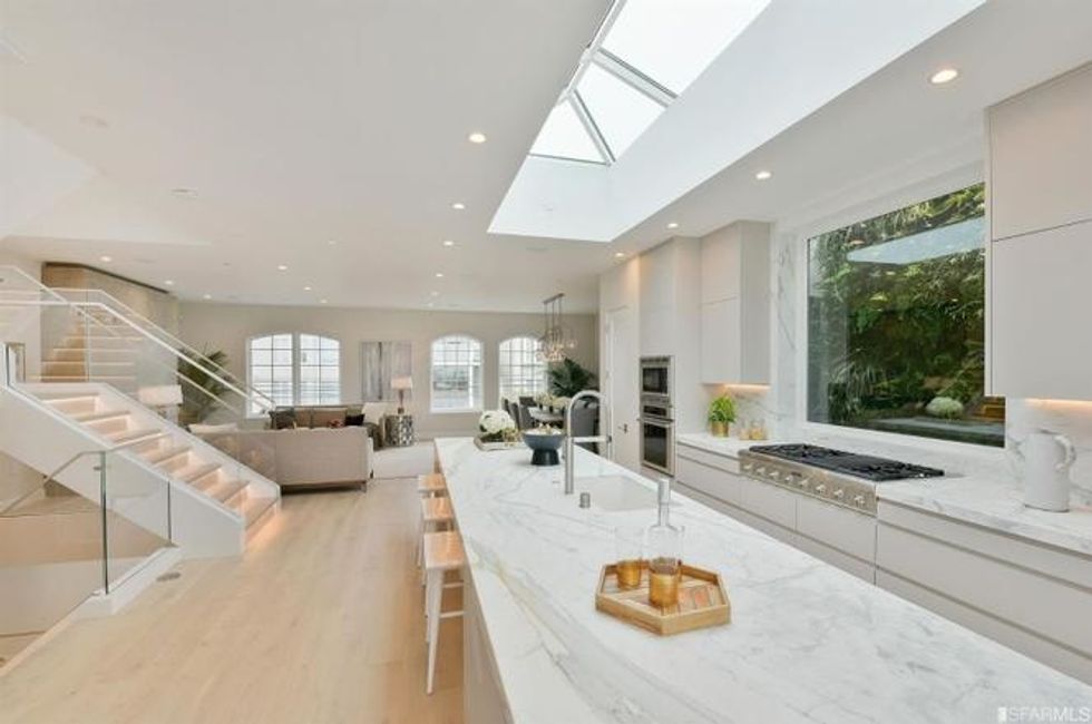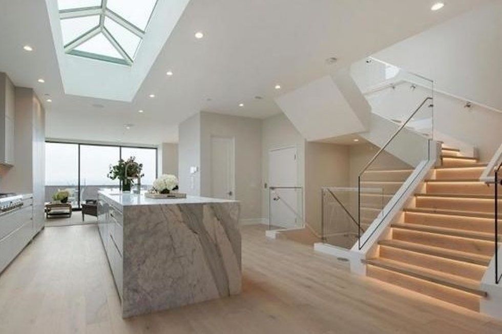 Clean and modern are the keywords in this abode, where tons of white marble, pale wood, and organic elements lend a spa-like vibe, and the space practically glows thanks to large arched windows, skylights, and a back-lit geometric staircase.