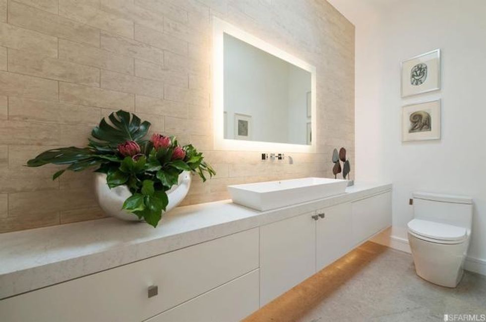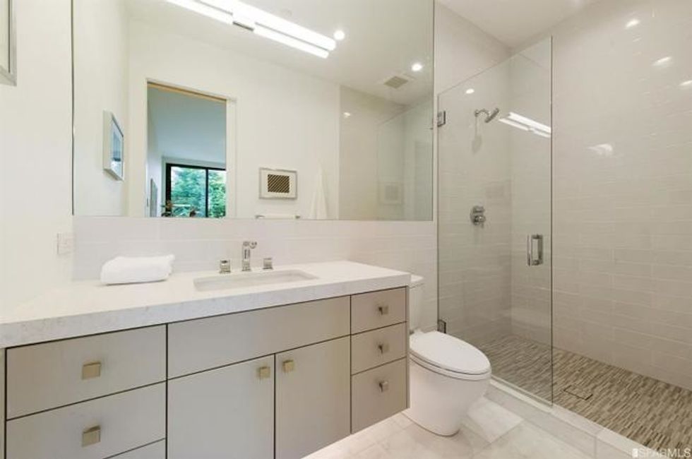 The main floor gives way to private quarters including a guest suite, two bathrooms, the laundry room, and interior access to the garage. One level up is a study, as well as three more bedrooms including the master suite. Here, you can find a private deck and an entire wall of windows looking out onto the backyard; a walk-in closet; and a big bathroom with a deep soaking tub, glass-enclosed shower, stone flooring, and an extra-long double sink vanity with back lighting—a common thread in most of the bathrooms in the house.