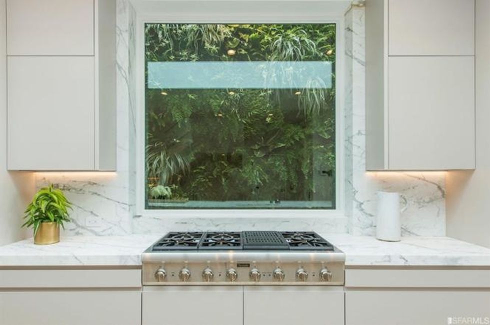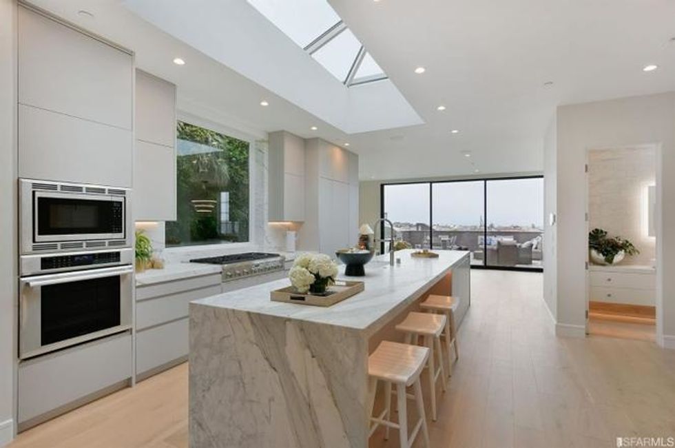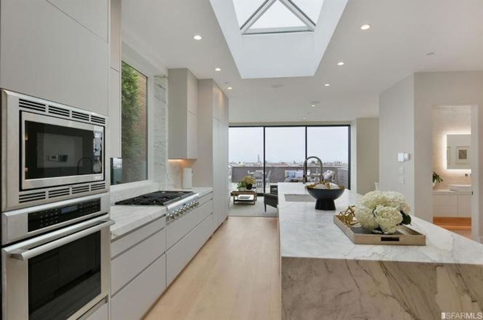 Another level up takes us to the entertaining areas with a dining room that opens out to a deck with barbecue. A great room lies on the other end, and in between, perhaps the most stunning setting in the entire home, is the open chef's kitchen swathed in pearly shades. A marble slab island floats in the center serving as a breakfast nook and storage. Matching countertops sit on sleek, modern cabinets, while a skylight overhead washes the space in light. Over the range is a window looking out to lush, green foliage.