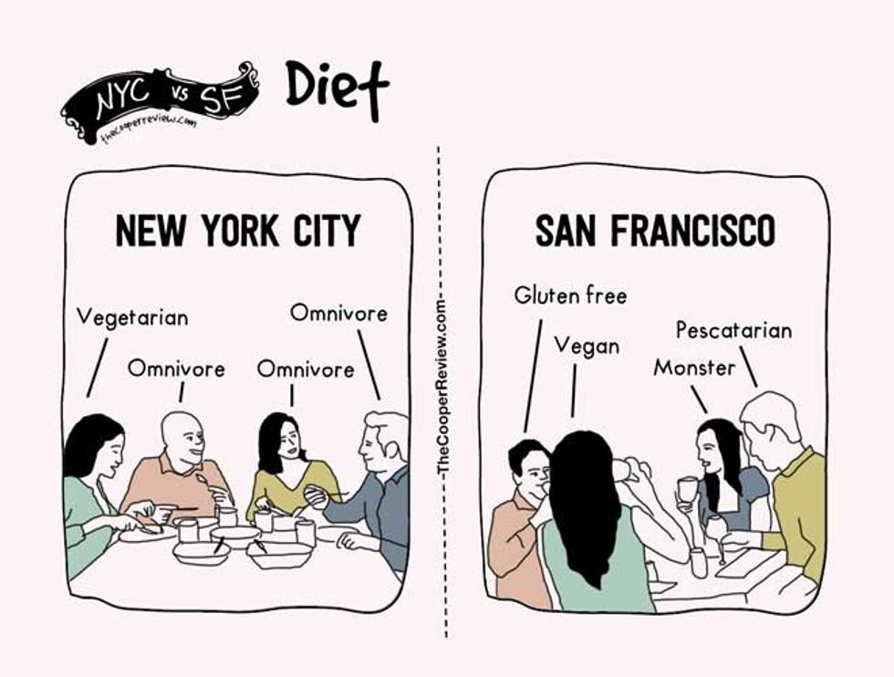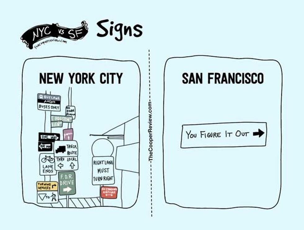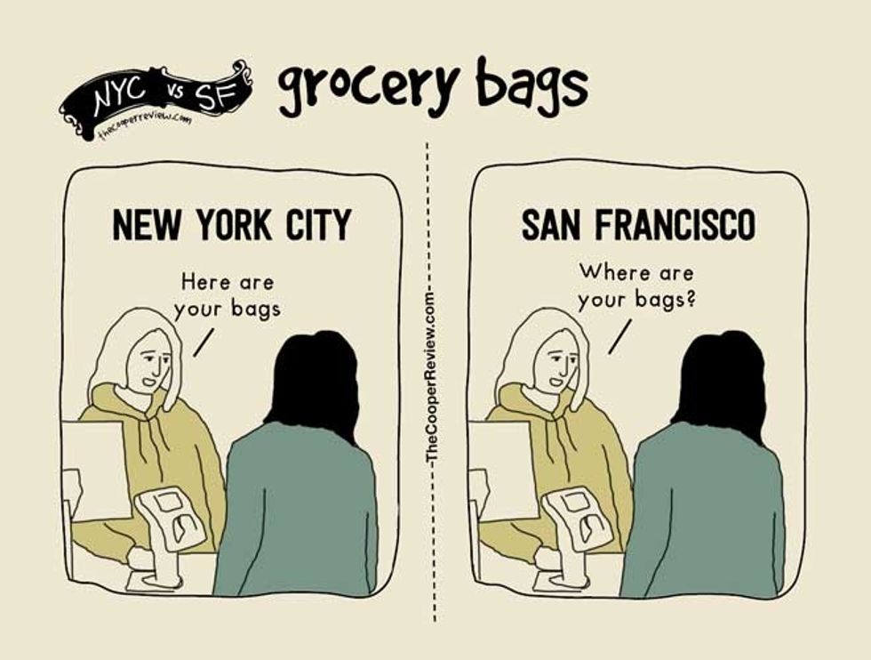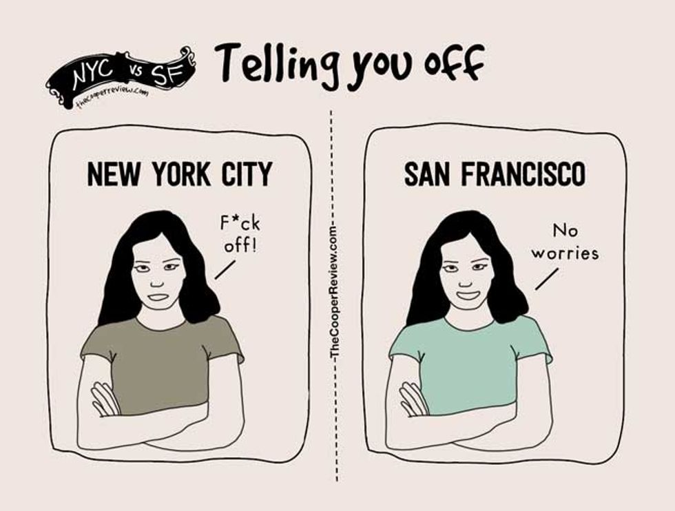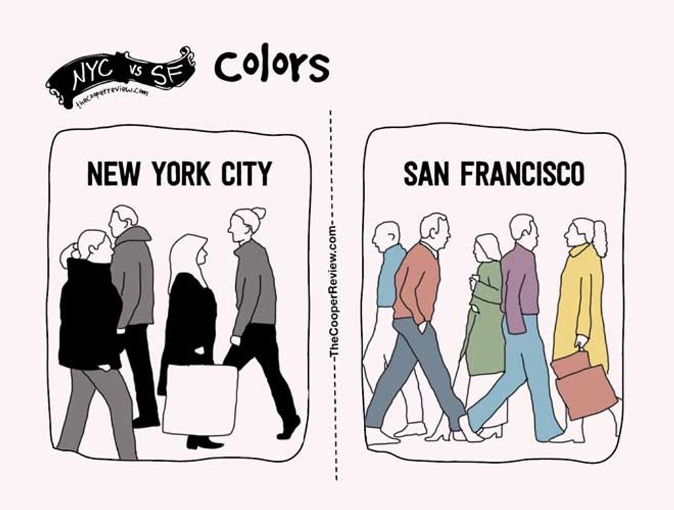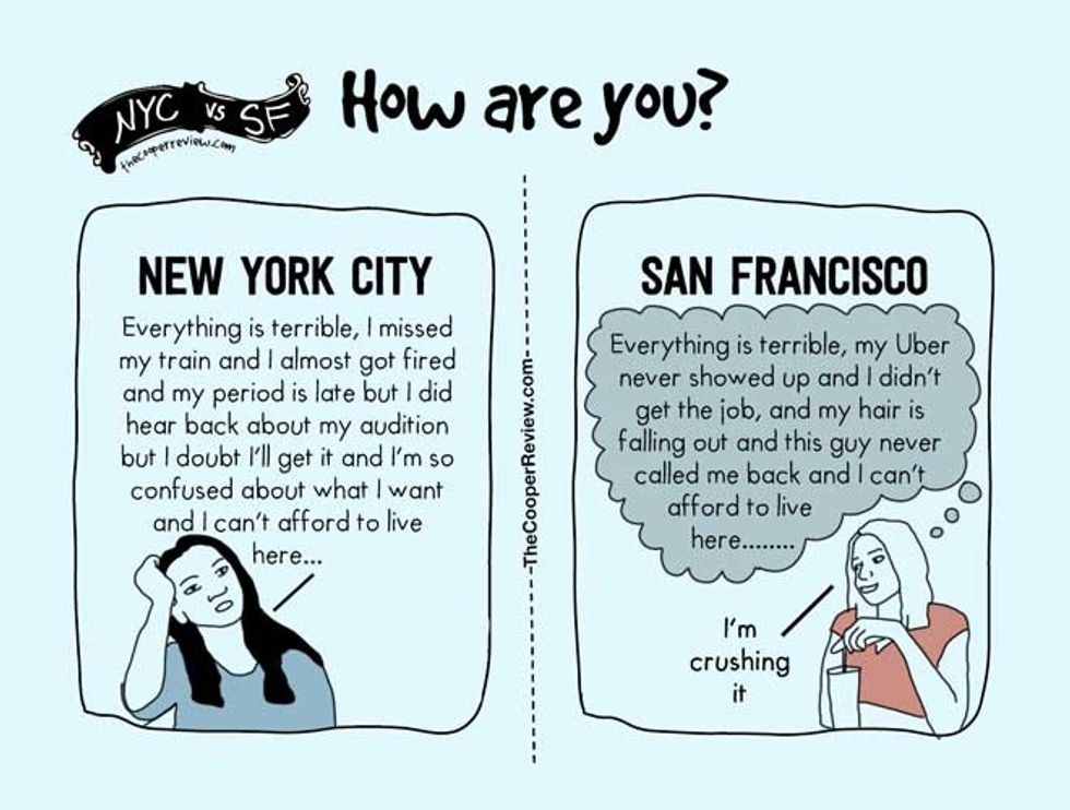 Comedian, author, blogger, and 2017 Hot 20 honoree Sarah Cooper has just released a new installment of her comic series that compares-slash-brilliantly-rips-on life in San Francisco and New York City. And there's a reason that this afore-linked article was 7x7's most-read story of 2017: The cartoons are hilarious AF.