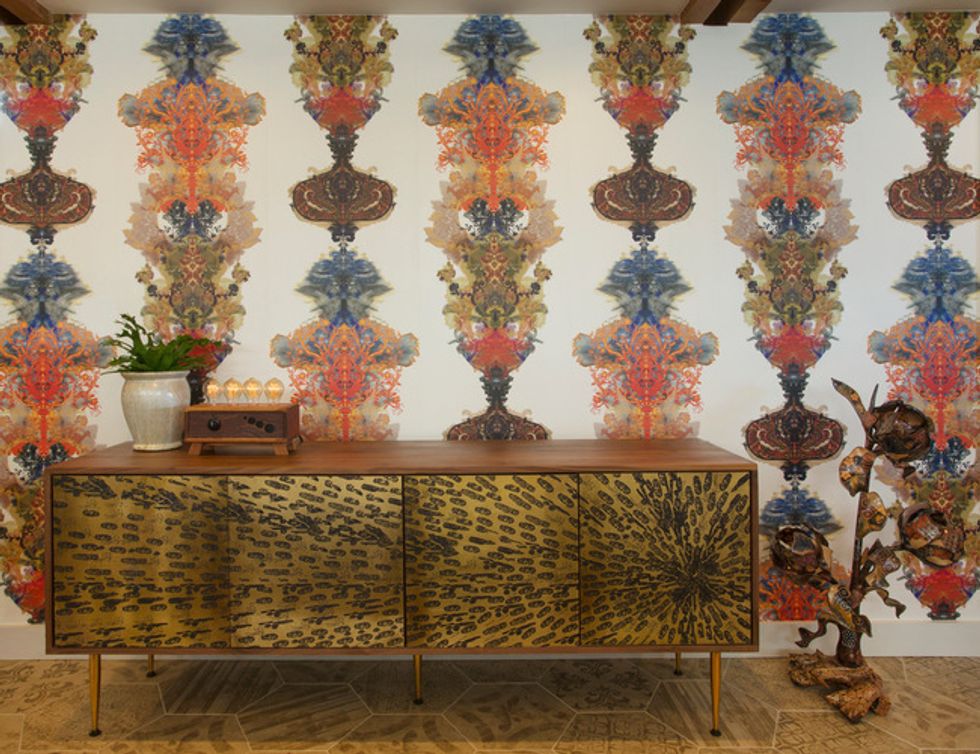 The design team kept the bed simple, soft and elegant in deference to the primary focal point of the room: a modernist credenza against the wall opposite the bed. The vivid wall behind the credenza is covered in Timorous Beasties' Grand Blotch Damask wallpaper. The homeowner fell in love with the wallpaper company when she used to live next to its showroom in London.