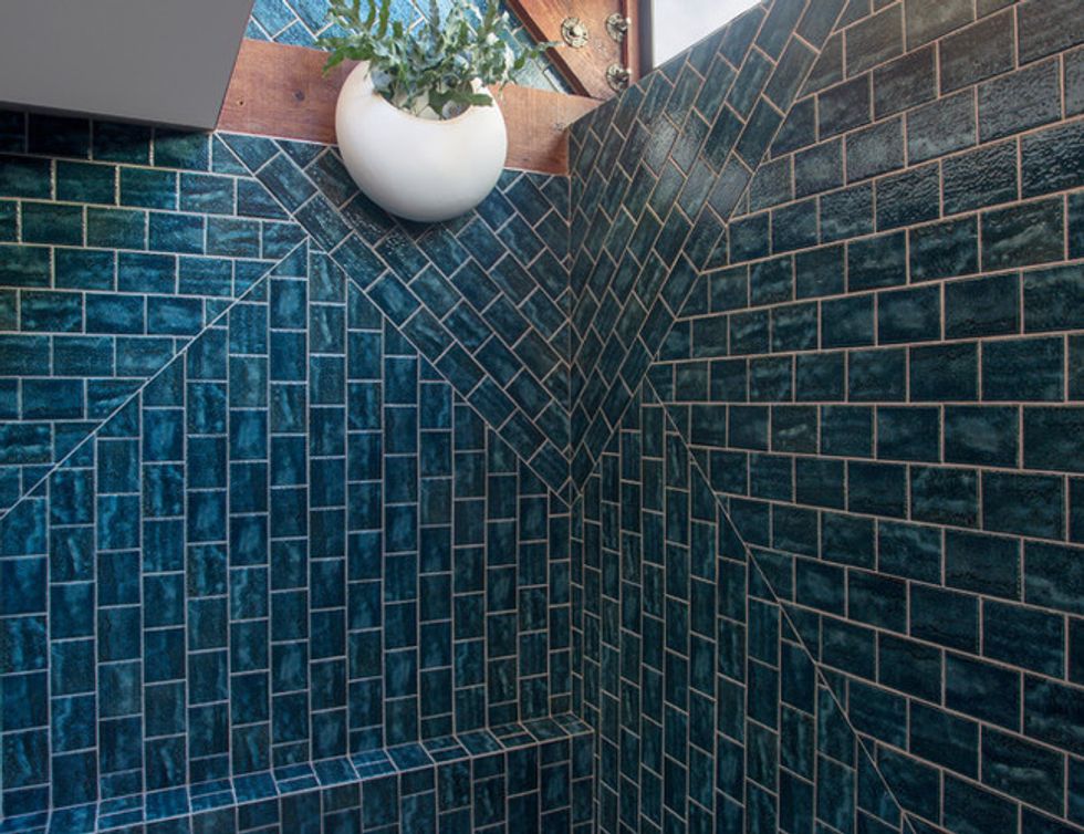 The focal point of the master bathroom is an enormous walk-in shower covered with tile laid in an unconventional manner. Cutting and installing the shower glass and tiling on a perpetually moving boat presented a challenge to the installers. One of the tradesmen happened to notice that there was a particular point in the tidal cycle at which the boat seemed most stable, so the team made sure to snap their plumb lines at the same time every day.