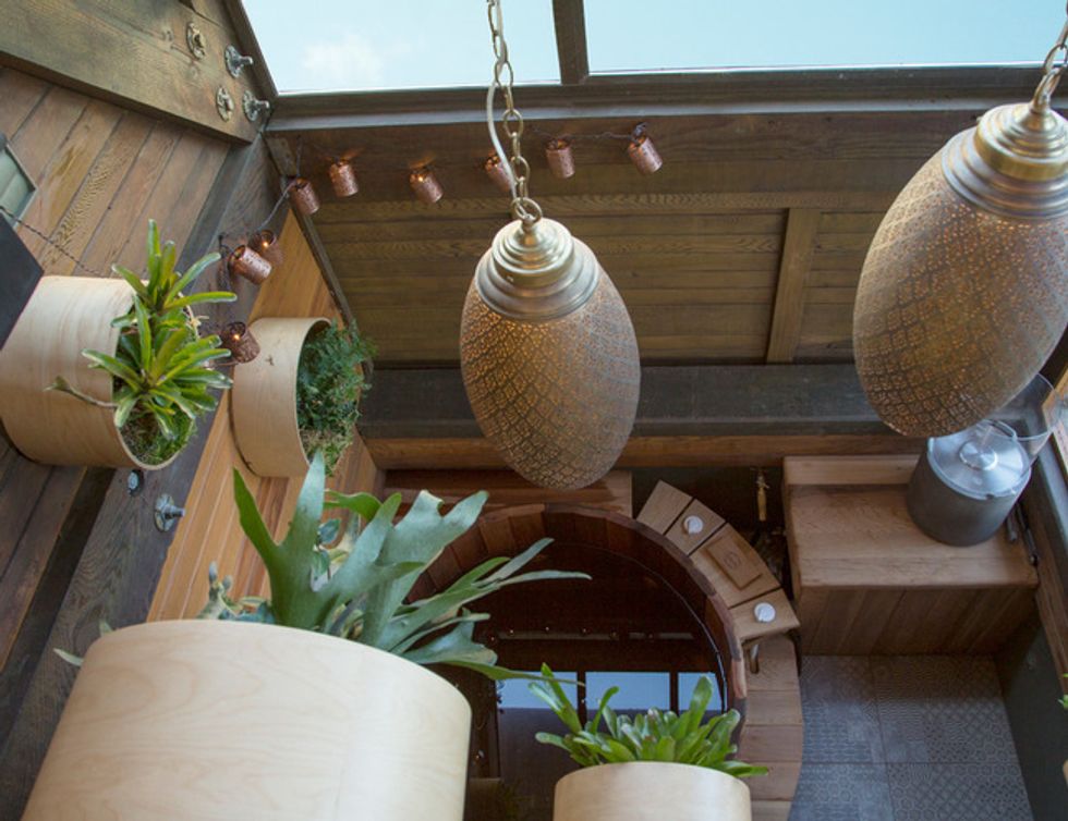 A two-story indoor-outdoor bathroom features a Japanese soaking tub, ethanol fireplace and Moroccan brass pendants. This room was originally designed as an outdoor deck space that was primarily used for storage. Due to the narrow stairwells, hauling in the tub was a major undertaking that begged for a creative solution. The answer came in the form of a La Cantina window on the main level that can be completely opened for bringing in bulky items such as the tub, bed and sofa.