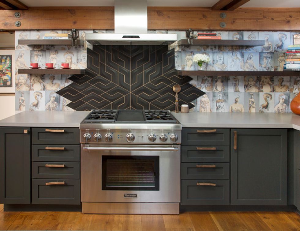 The designers felt fortunate to work with a homeowner who had such a vision and passion for the idea-generation process. Her kitchen ended up being a laboratory for some of her favorite design ideas and materials. The previous kitchen was loaded down with a tall fridge and traditional upper cabinets, resulting in a feeling of confinement. The new design preserves the U-shaped footprint of the cabinetry but replaces the uppers with open shelving and the tall fridge with a set of three paneled refrigerator drawers and one freezer drawer.
