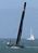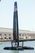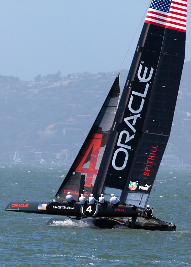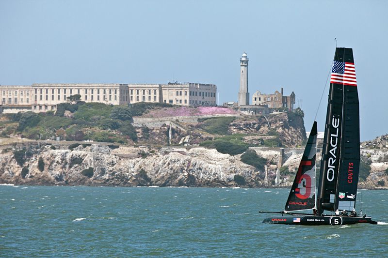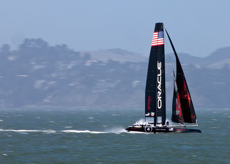 An Oracle boat passes by the Golden Gate Bridge while practicing in the Bay