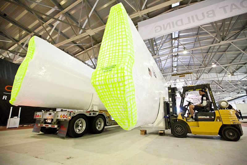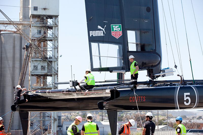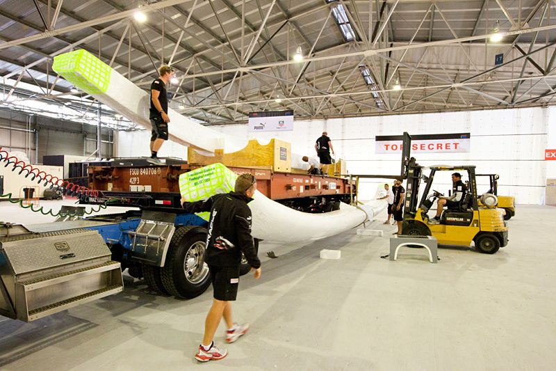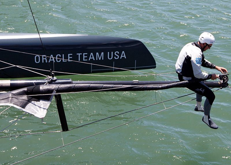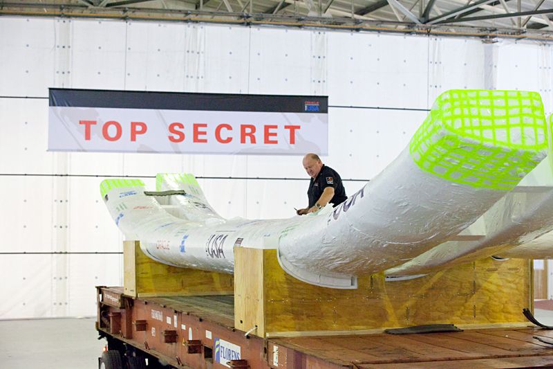 A member of the Oracle team prepares to reveal a cross beam of the new AC70