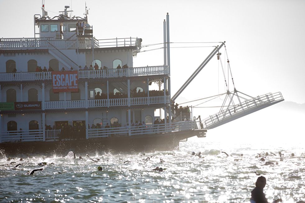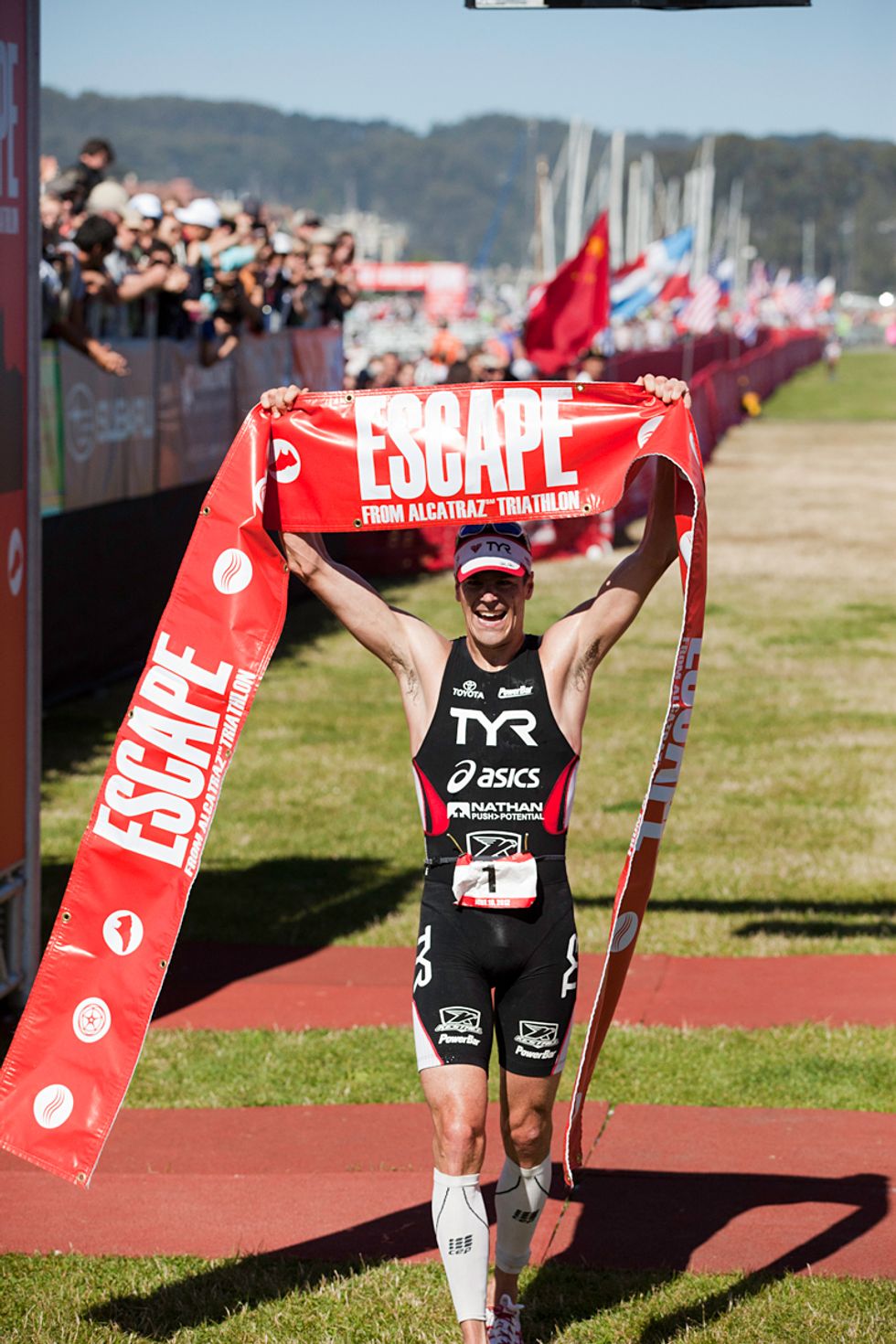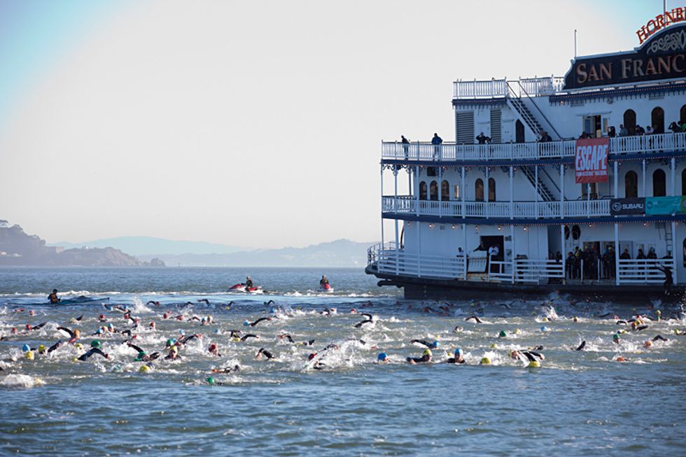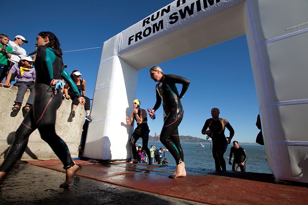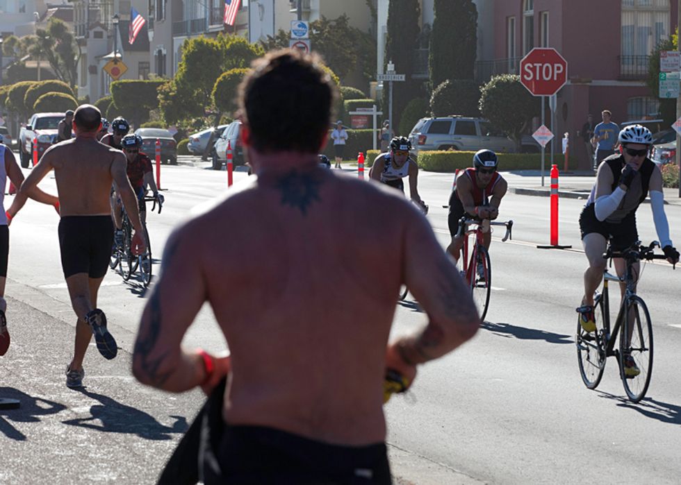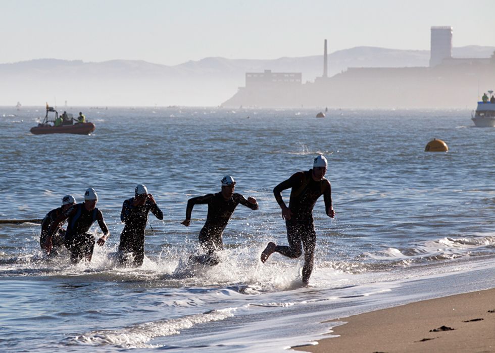 Beautiful, sunny weather shone upon the 2,000 amateur and professional athletes who braved the 1.5 mile swim from Alcatraz to the Marina Green. From the Marina, they took an 18-mile bike ride through hilly SF and finished it off with an 8-mile run that included the famous sand ladder at Baker Beach. Andy Potts of Colorado Springs won today for the 5th time setting a course record for the most ever won by a male. Leanda Cave won for the women.