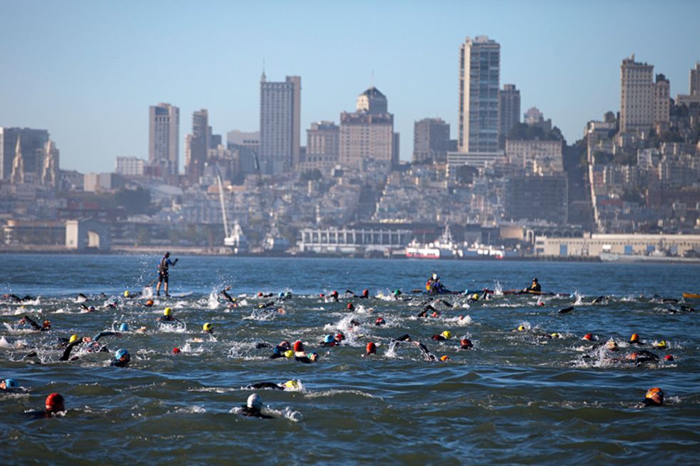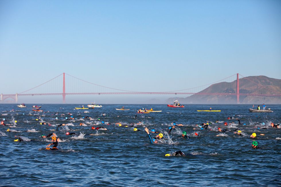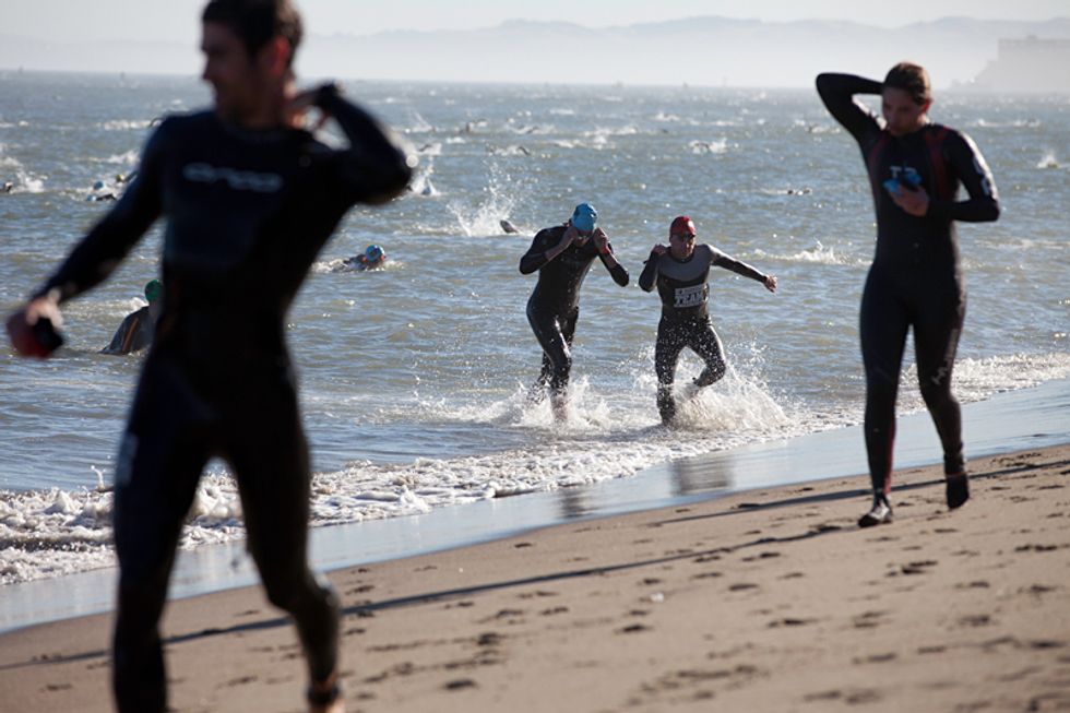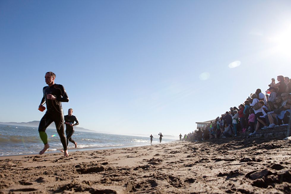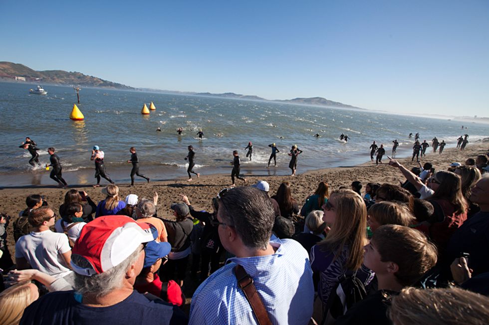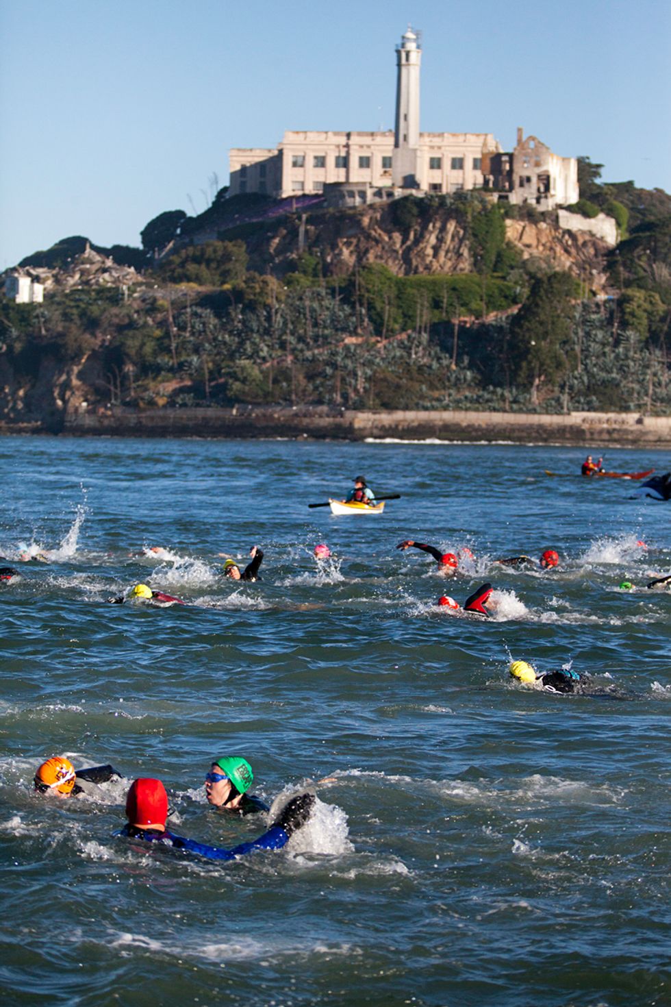 Beautiful, sunny weather shone upon the 2,000 amateur and professional athletes who braved the 1.5 mile swim from Alcatraz to the Marina Green. From the Marina, they took an 18-mile bike ride through hilly SF and finished it off with an 8-mile run that included the famous sand ladder at Baker Beach. Andy Potts of Colorado Springs won today for the 5th time setting a course record for the most ever won by a male. Leanda Cave won for the women.