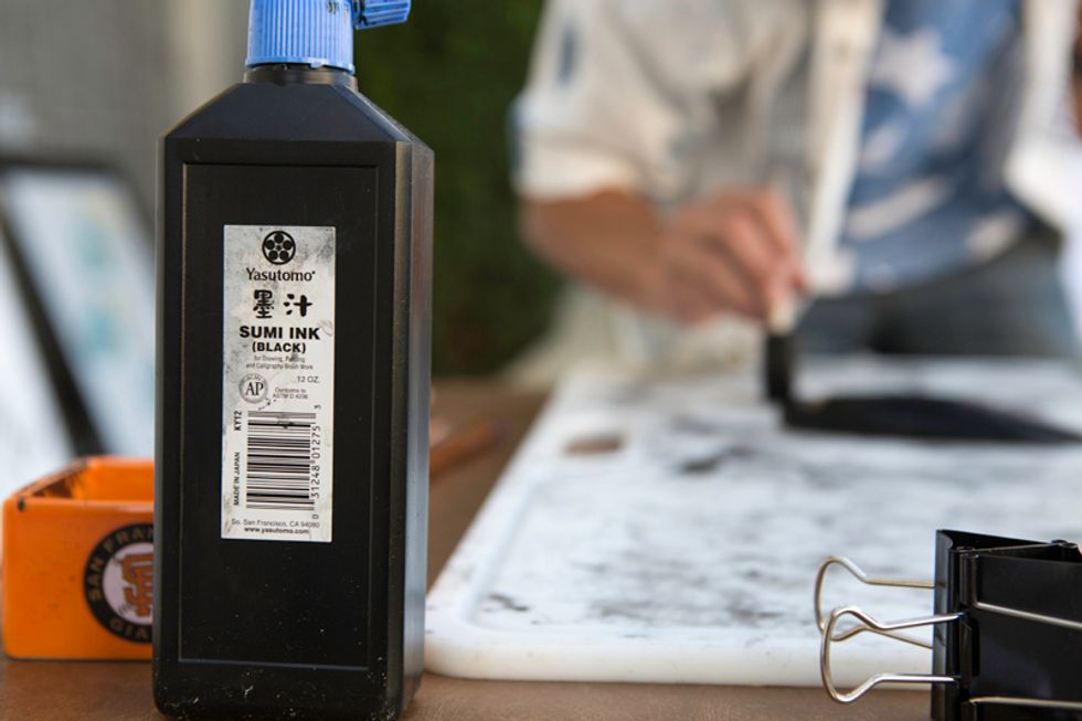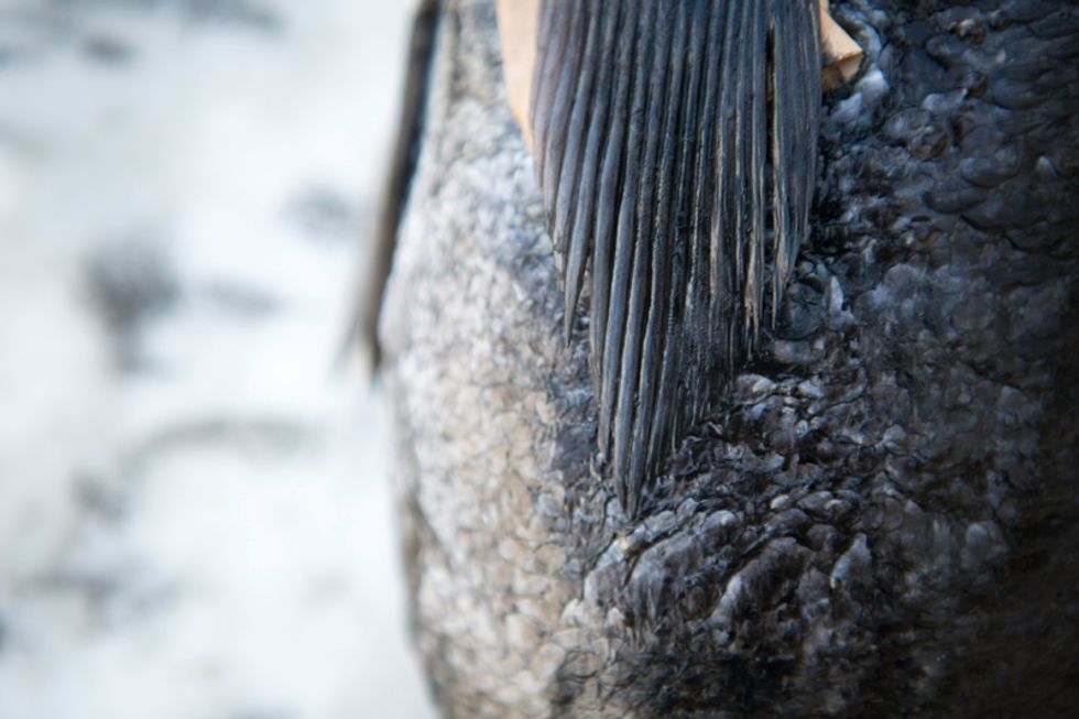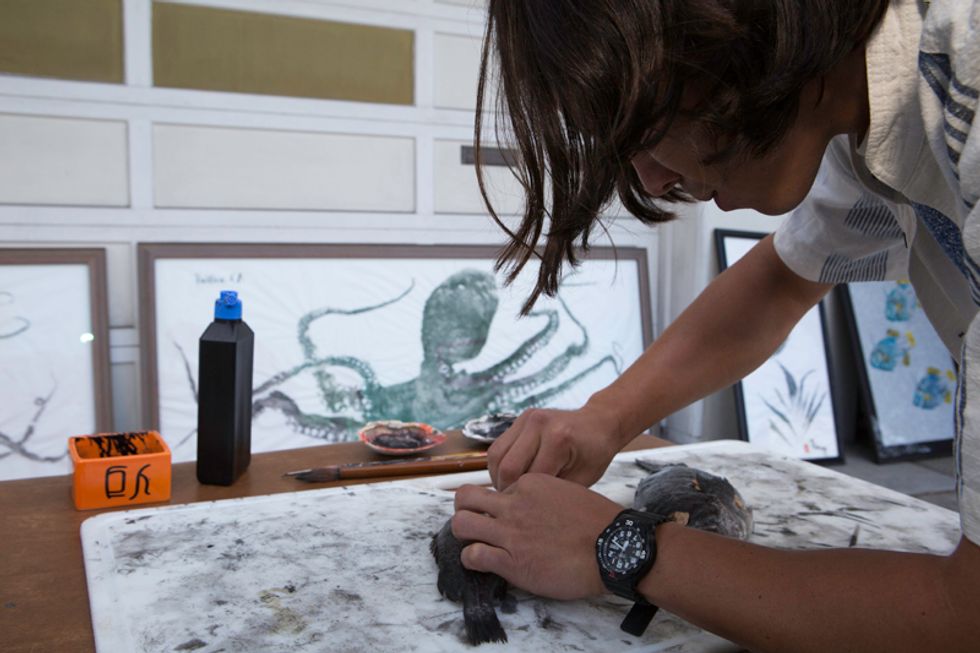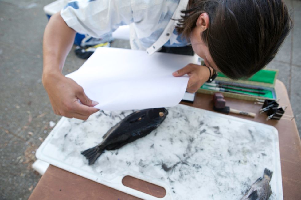 First dried and prepared to make sure none of the ink gets into the meat of the fish, the catch is then covered in Sumi caligraphy ink, and rice paper is slowly placed over it to create the print. Sounds pretty simple, but's there's many small details that go into making the perfect print.