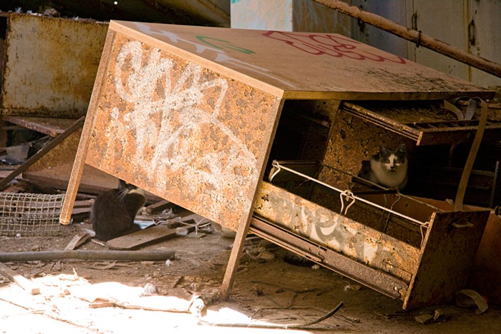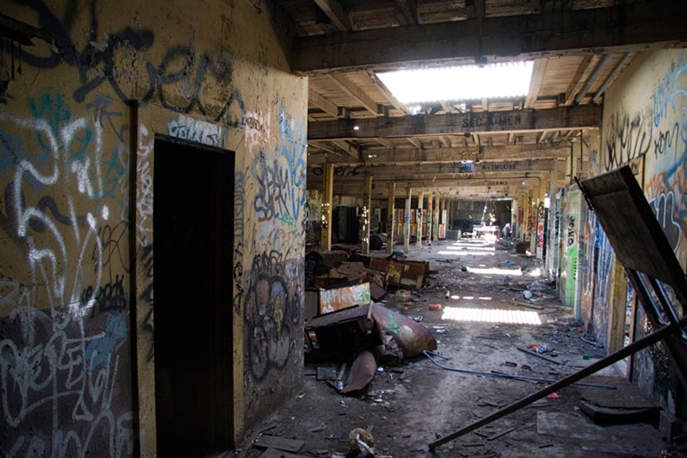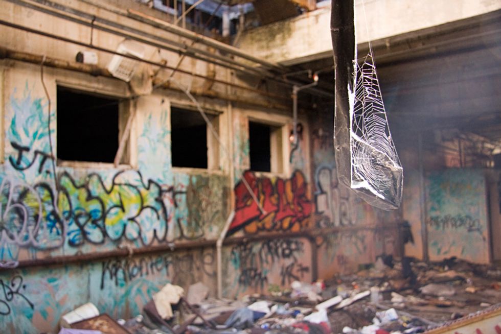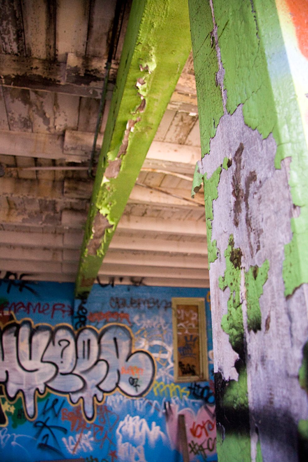 The building has become an open canvas for graffiti artists, a vandals playground and a home for feral cats and the homeless. In the north end of the complex, sections of the former men's locker room are now sanctioned off as one man's home.