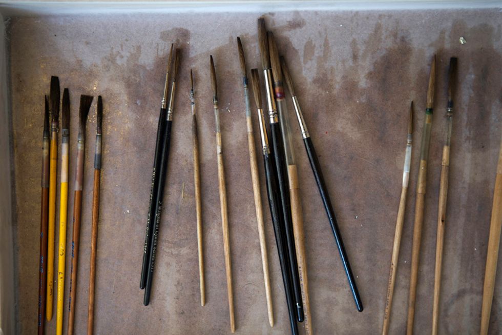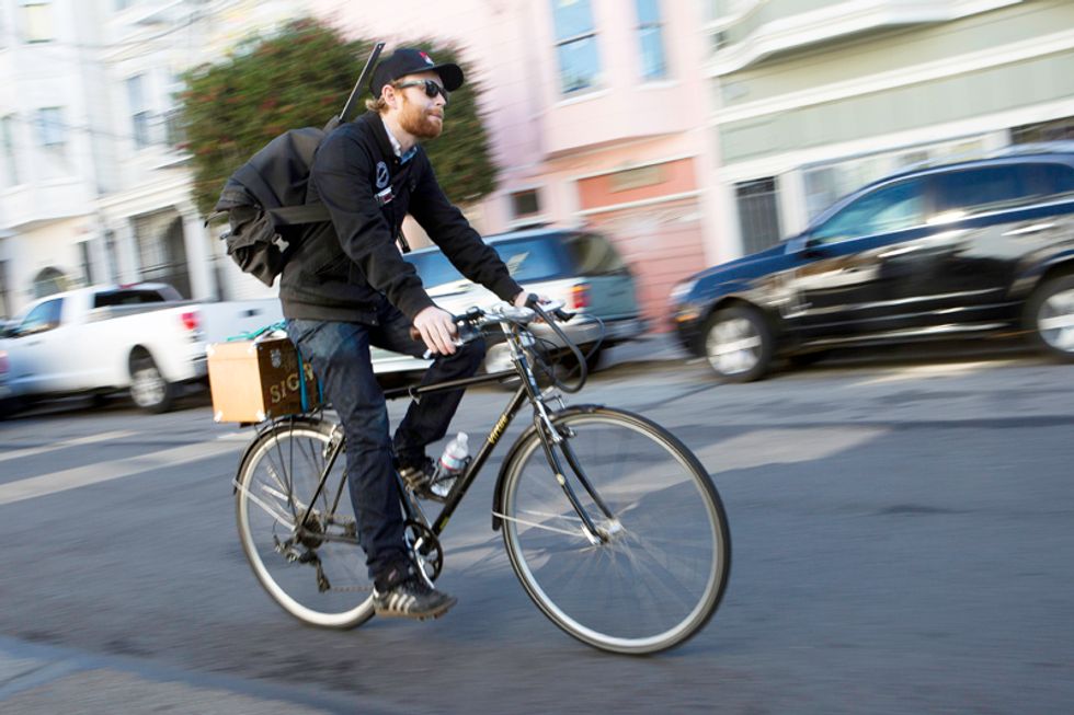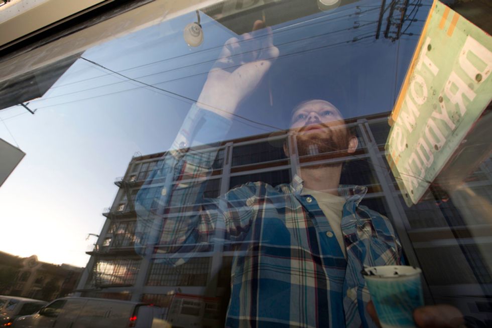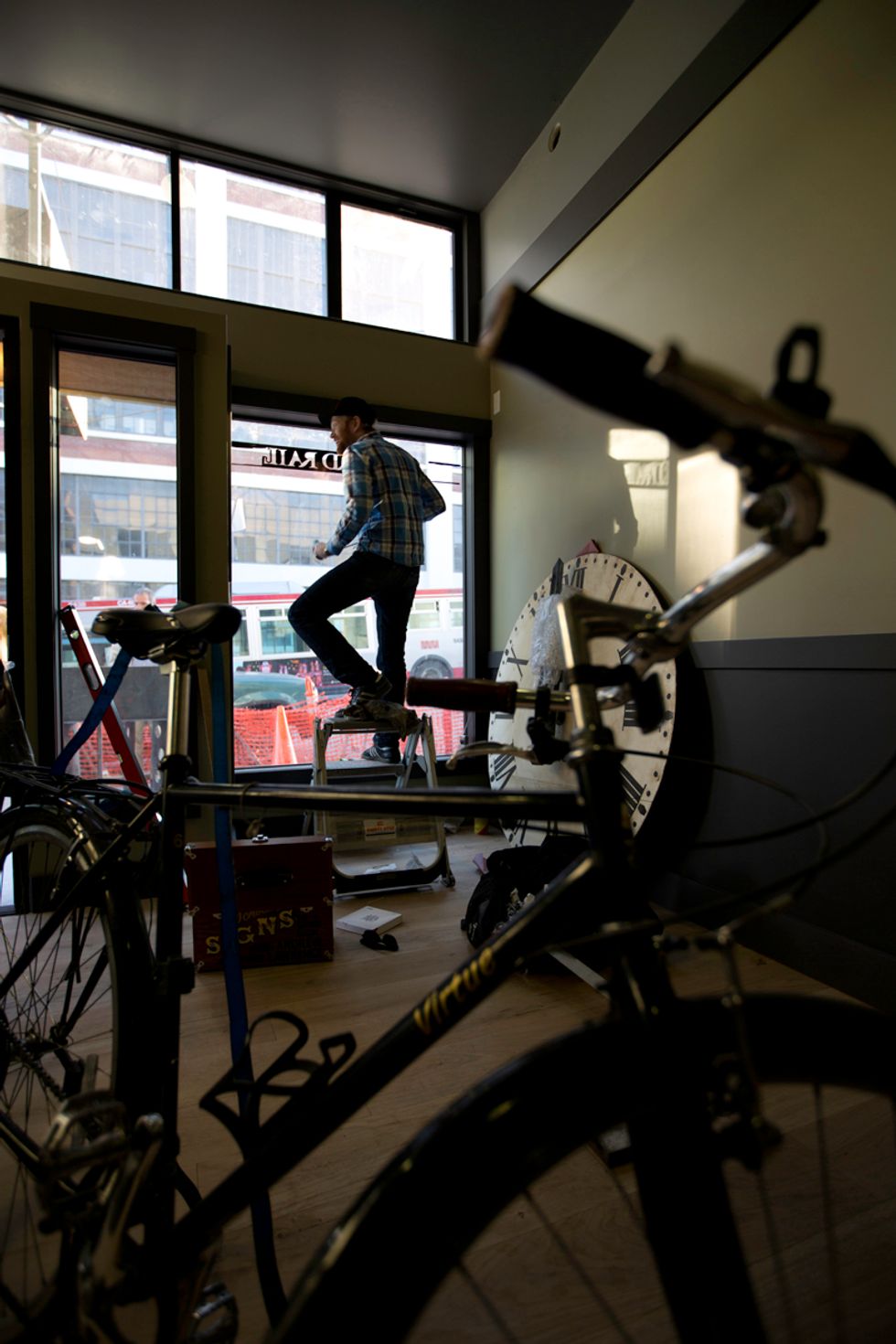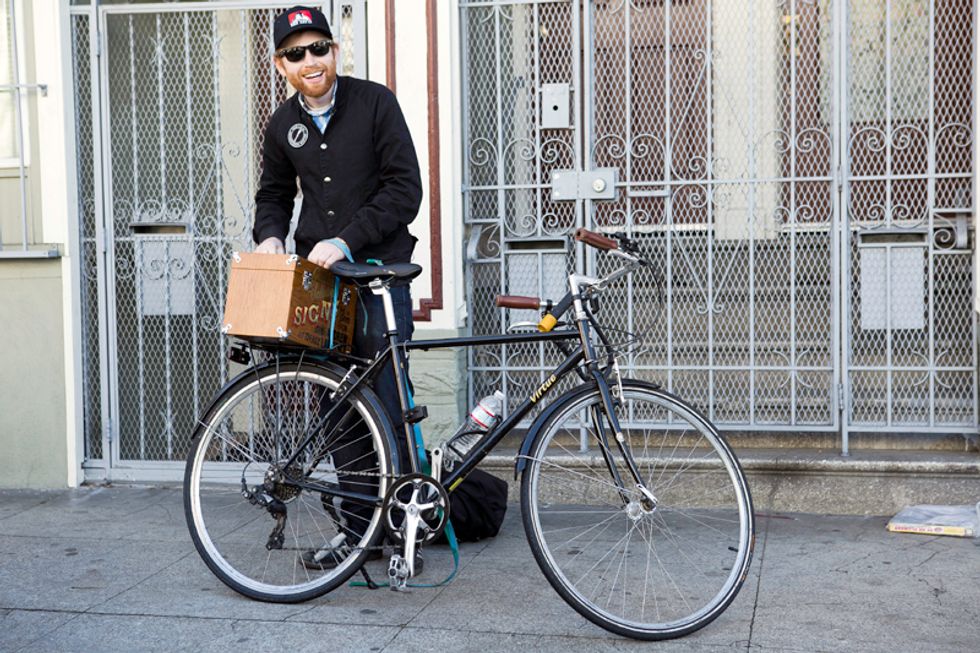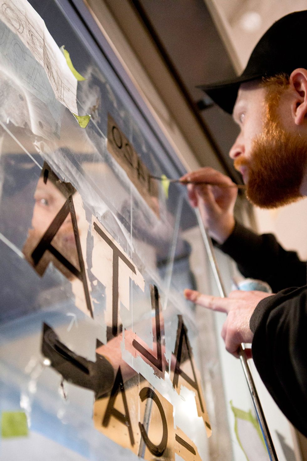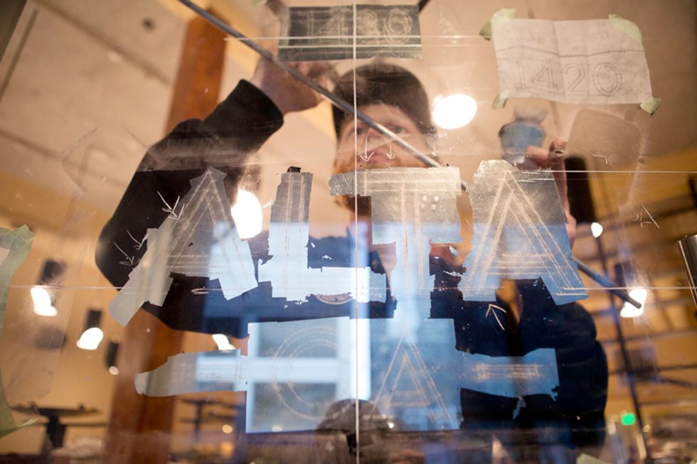 The first stop was Lawrence's Potrero studio where we got a little introduction to the process of sign painting, then it was off (via bicycle) to the new Market St. restaurant ALTA, opening in late December, to observe the painting of the doorway sign. We watched as Lawrence demostrated his traditional techniques of fine hand-lettering. Check out him out in full swing through the photos.
