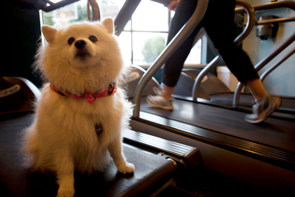 Here's "Coyote" striking a pose on a treadmill at fit Bernal fit. No, dogs are not allowed on the treadmills. But the gym does have doggy care.